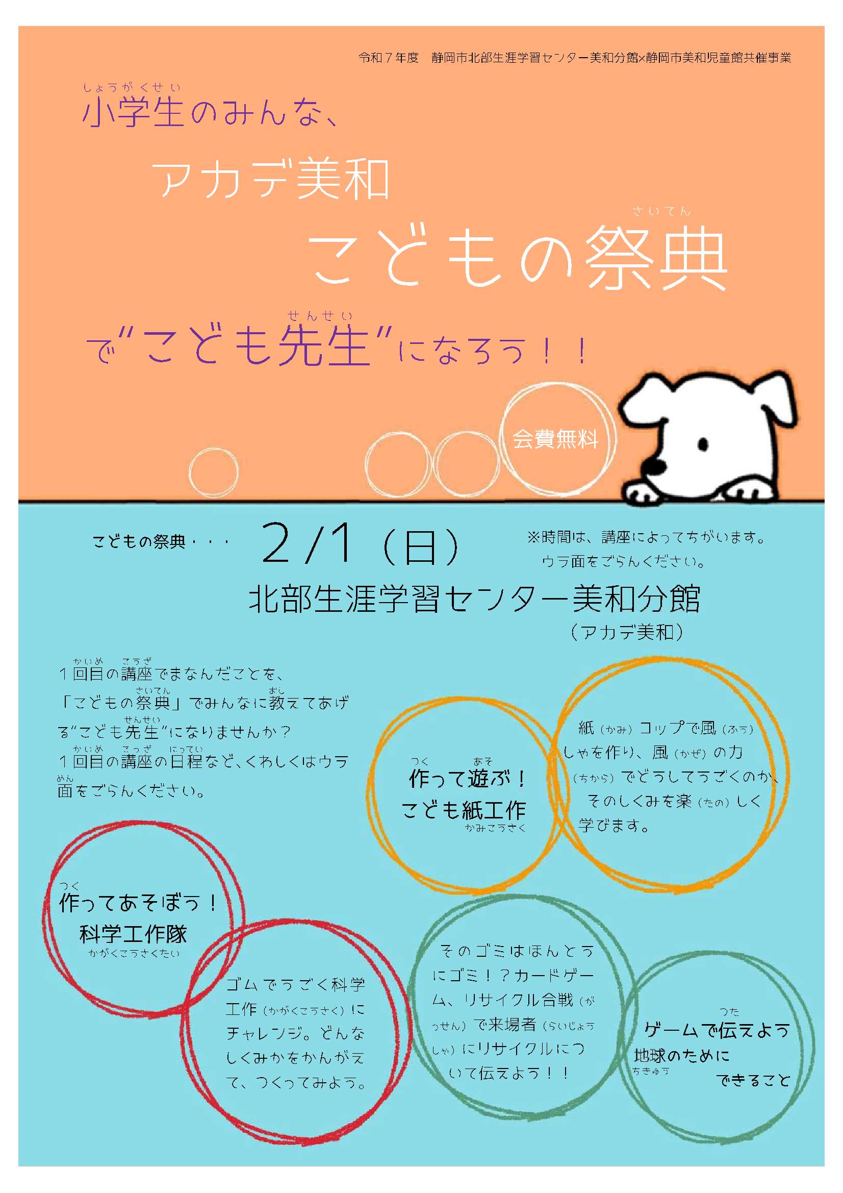 | 内容 | こども先生が運営するさまざまなワークショップを体験できます。 こどもや親子連れはもちろん、地域の方々も大歓迎!世代を超えた交流をお楽しみください。 詳しくは、下のチラシをご覧ください。 |