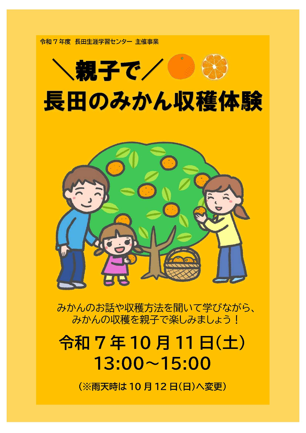 | 内容 | 長田地区で栽培されているみかんについて学んだのち、親子でみかんの収穫を行います。 ※みかんの生育状況によって開催日がずれる可能性があります。 |