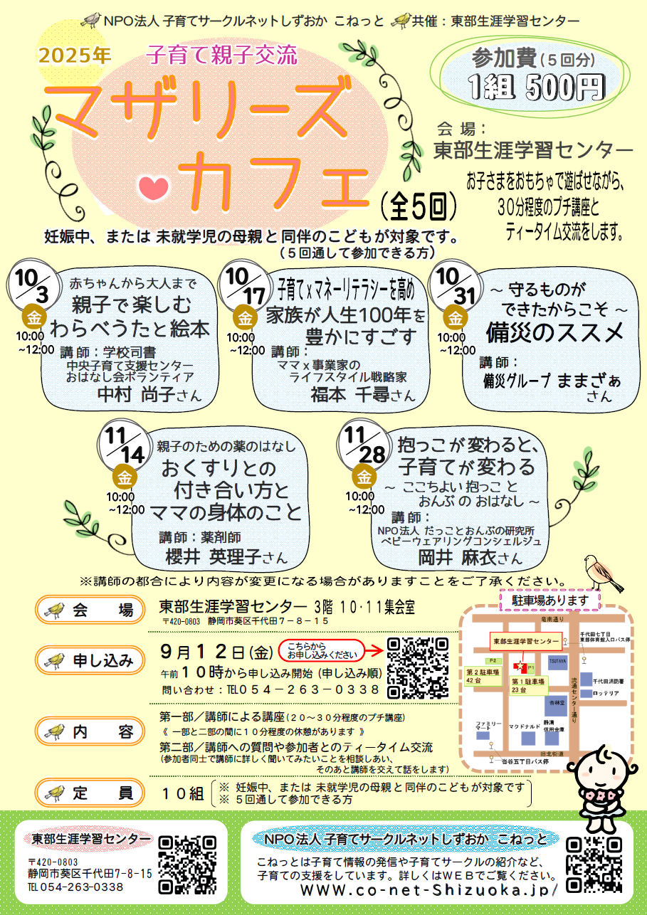 内容 | 子育てに役立つミニ講座とママ同士のカフェ交流会を行います。 |