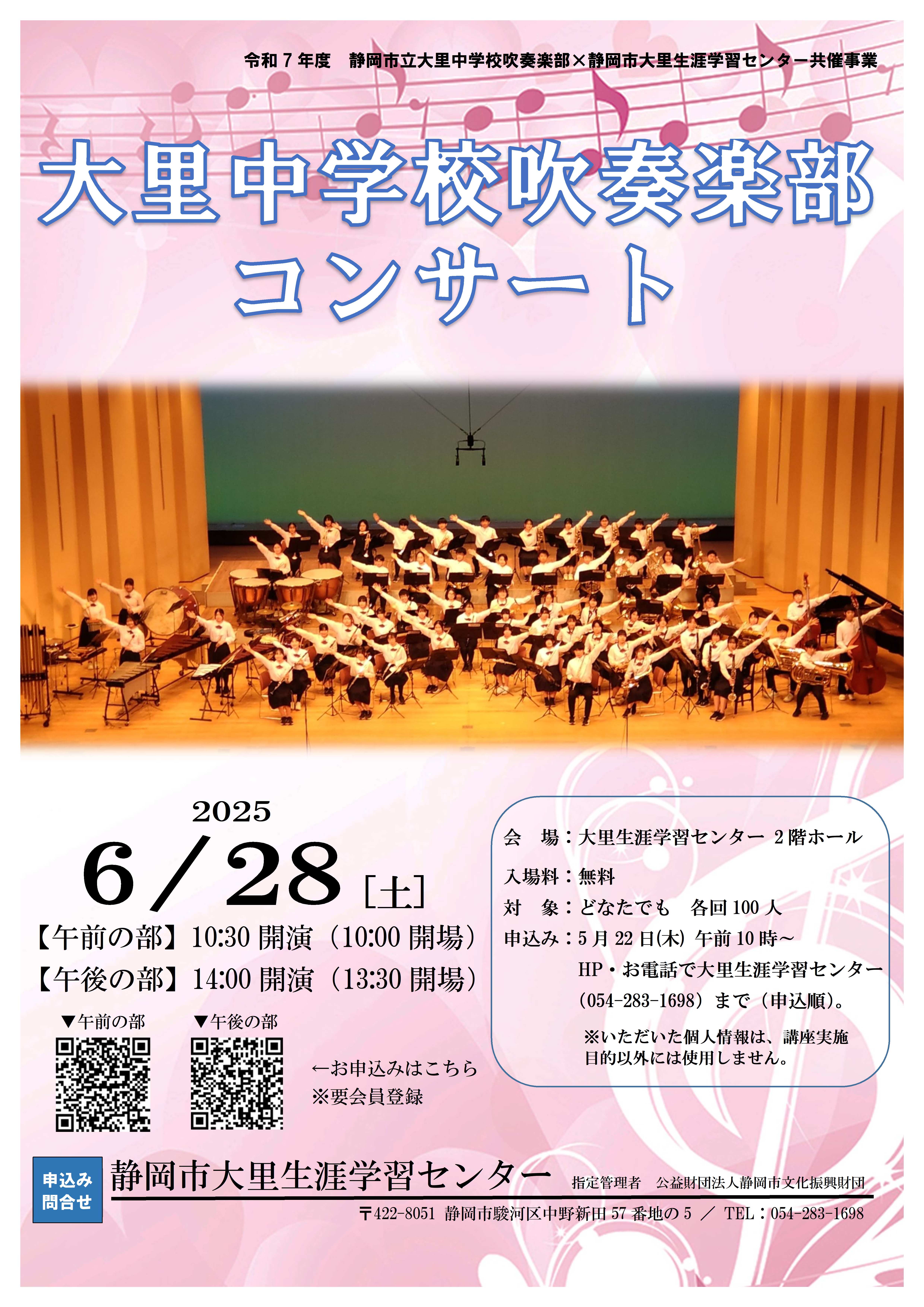 | 内容 | センターに隣接する静岡市立大里中学校吹奏楽部による地域の方向けコンサート(午前の部)。 ※午後の部の申し込みは別ページ(午後の部)からお申し込みください。 ※(午前の部)10:30~12:00 (午後の部)14:00~15:30 ※1回の申し込みで5人まで受付可能です。 ※車椅子にて来場予定の場合はその旨をお知らせください(HPから申し込みの場合は備考欄に記入)。 |