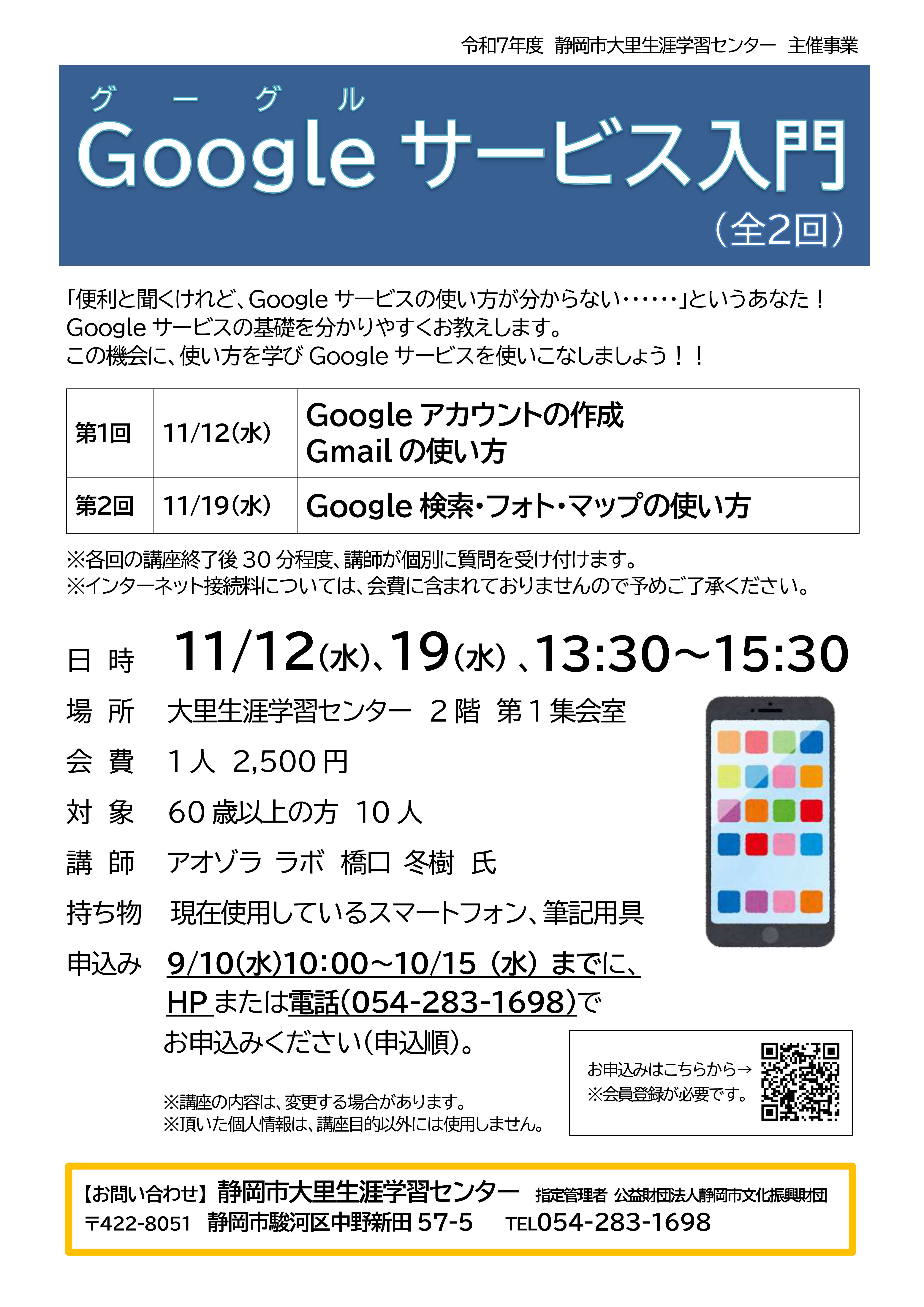 内容 | ご自分のスマートフォンを使って、Googleが提供するウェブサービス(GmailやGoogleマップなどのアプリケーション)について学ぶ体験講習会。 |