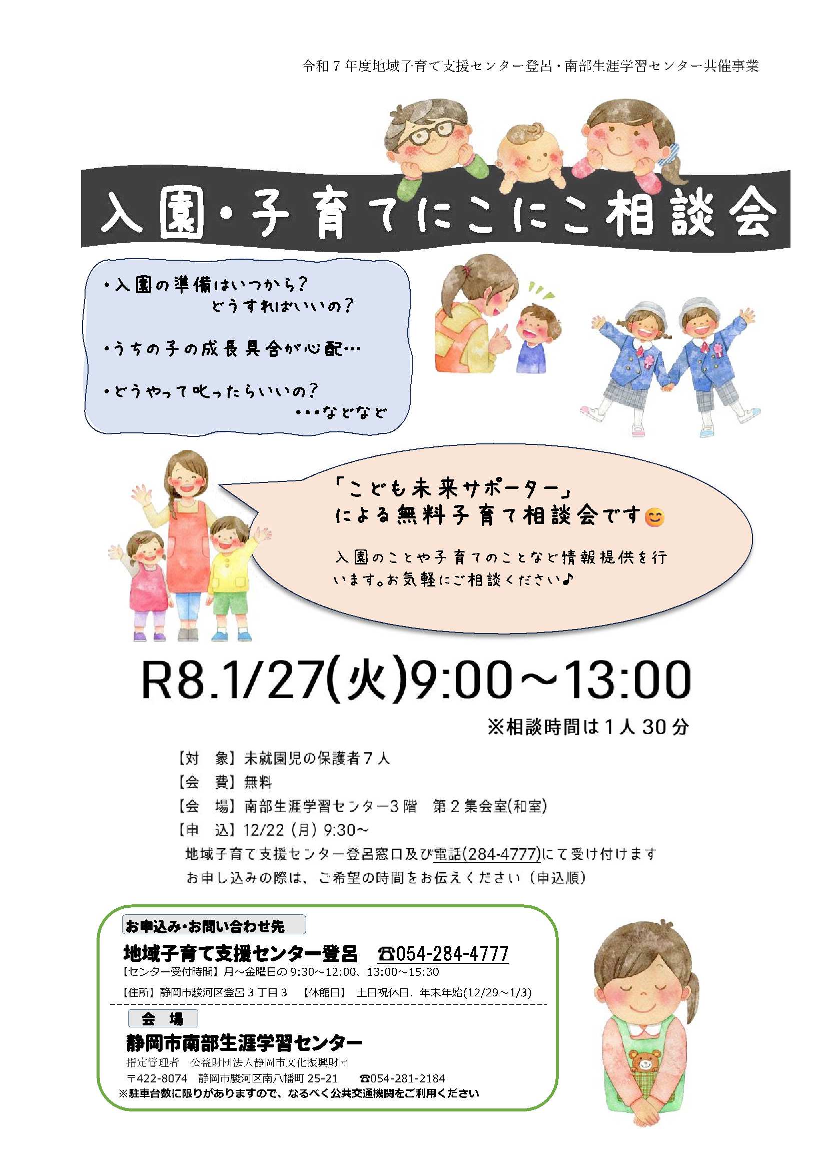電話・窓口[12/22(月)、9:30~・申込順] ※地域子育て支援センター登呂(054-284-4777)へ申し込む。申し込みの際に希望の時間帯をお伝えください。 2025/12/22から受付開始します |