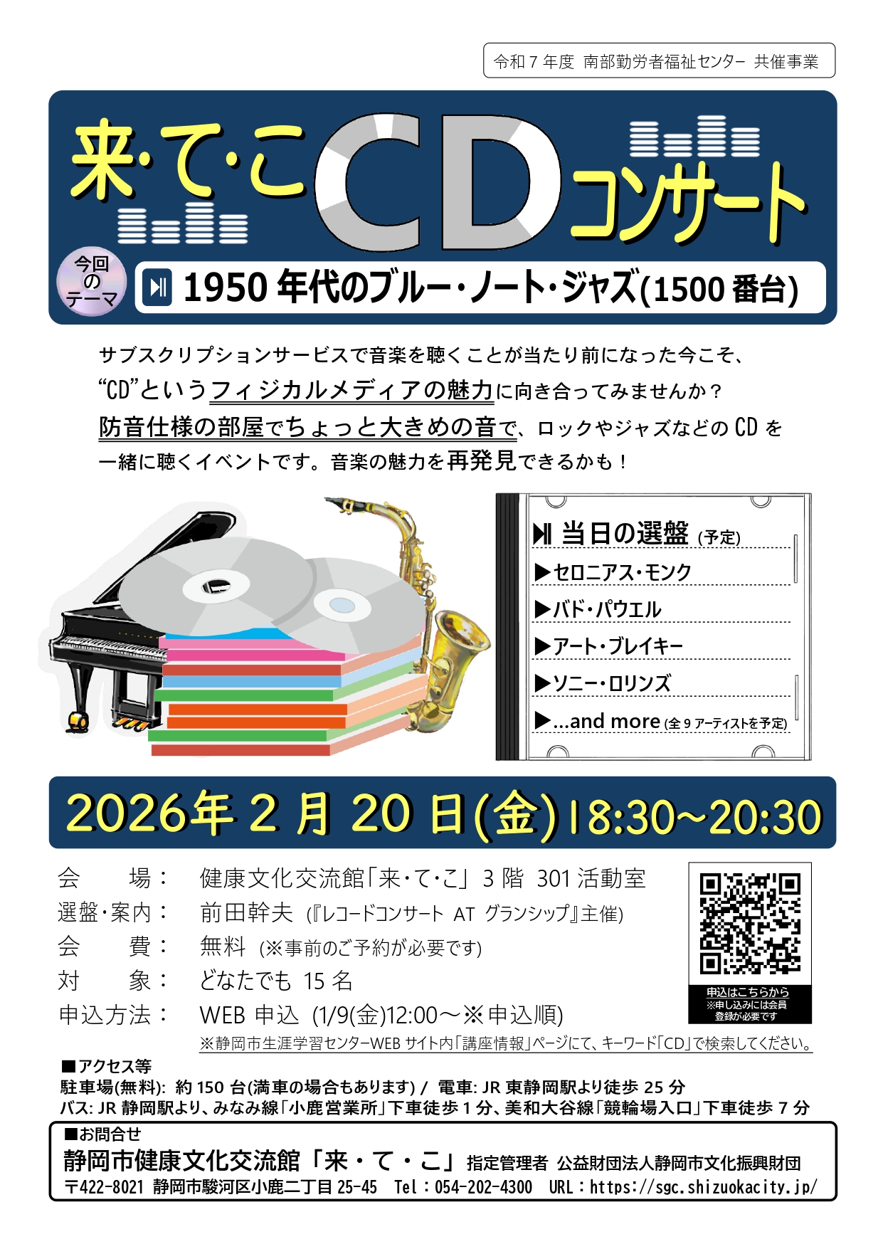 | 内容 | 各回ごとテーマに沿って選盤したCDによる音楽鑑賞会。2月のテーマは「ソフト・ロック×ザ・ミレニアム×ザ・モンキーズほか」。 会場:健康文化交流館「来・て・こ」 3階 301活動室 選盤・案内:前田幹夫 (『レコードコンサート AT グランシップ』主催) |