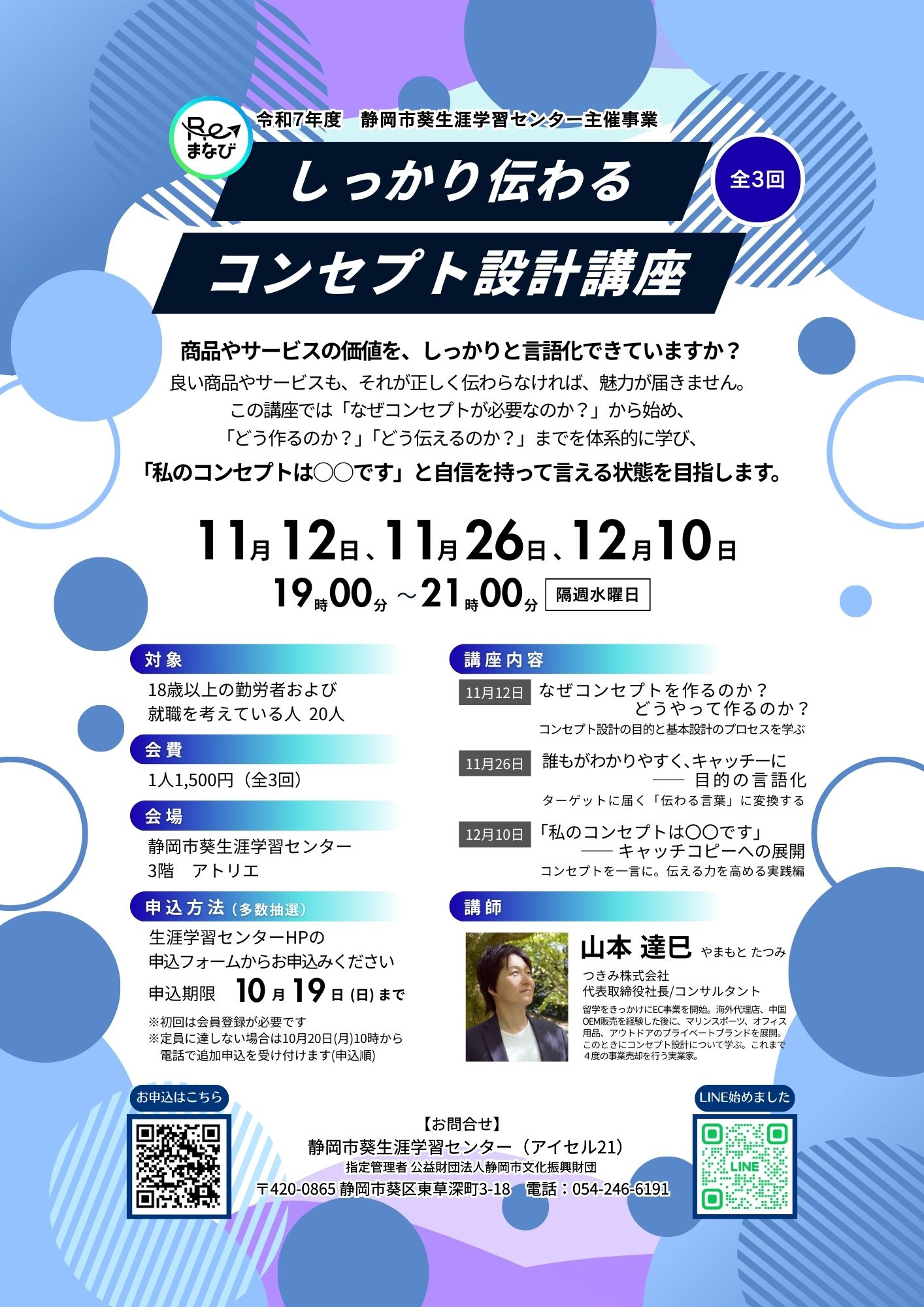 | 内容 | 商品やサービスの価値やターゲットを明確にし、競合との差別化やブランディングにつなげるコンセプト設計について学びます。 |