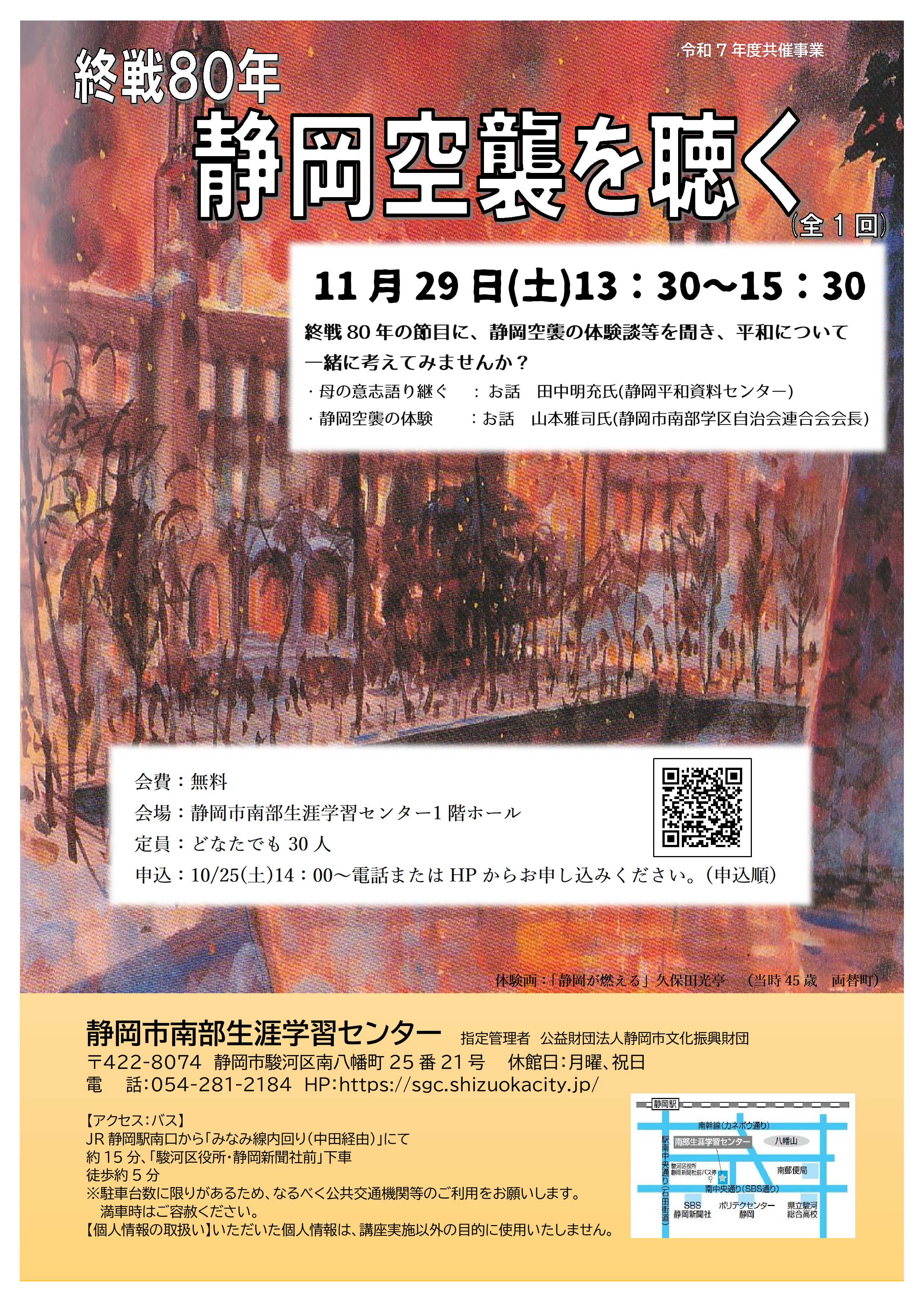 戦後80年の機会に地域の方から静岡大空襲の体験談を聴き、戦争と平和について考える講演会を行います。