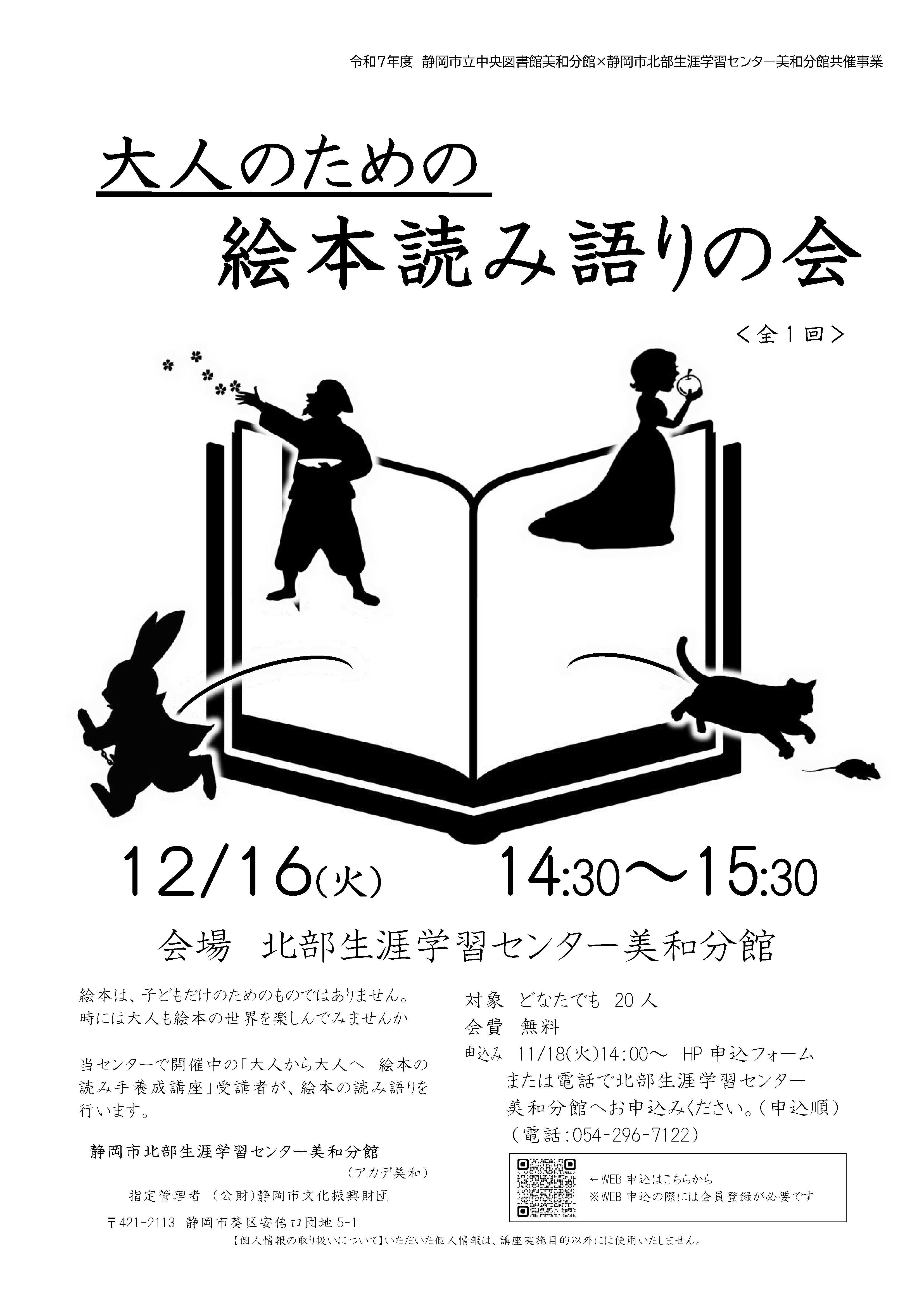 | 内容 | 「大人から大人へ 絵本の読み手養成講座」講座の受講生による、大人のための絵本の読み聞かせ会です。 |