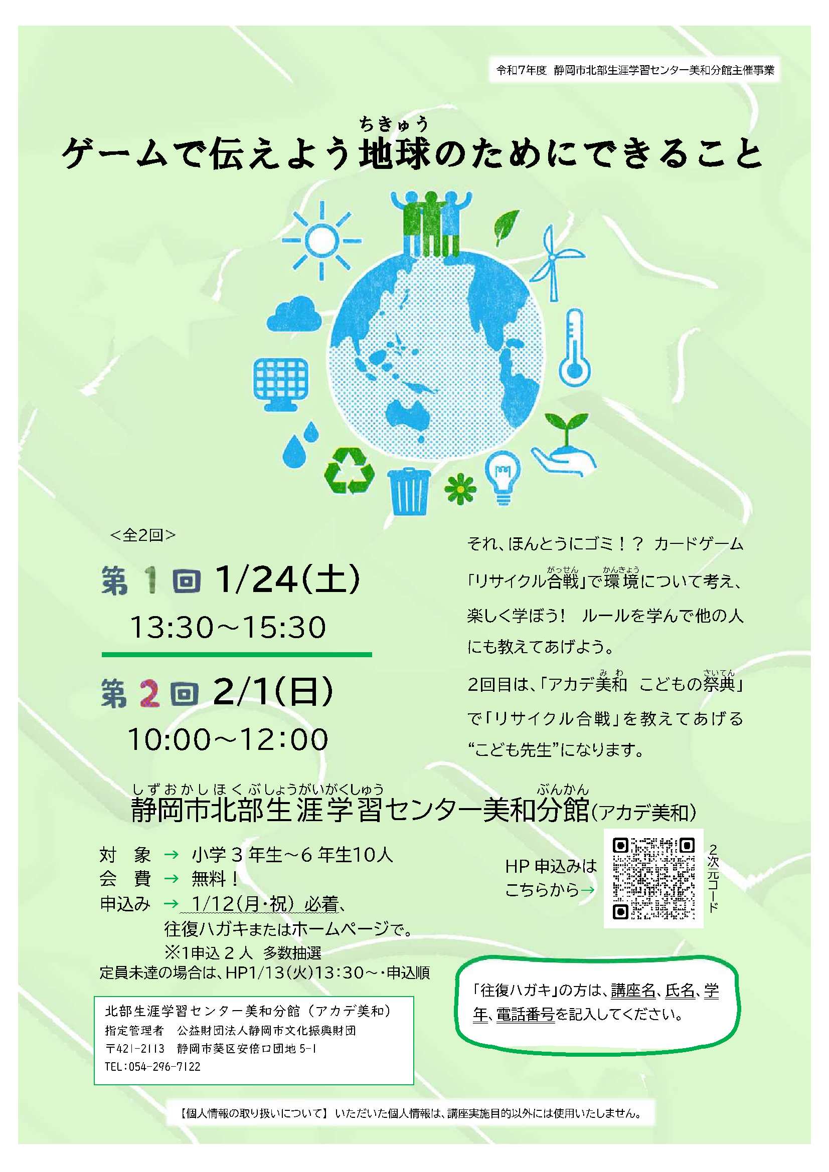 | 問い合わせ先 | 北部生涯学習センター美和分館(電話:054-296-7122) |