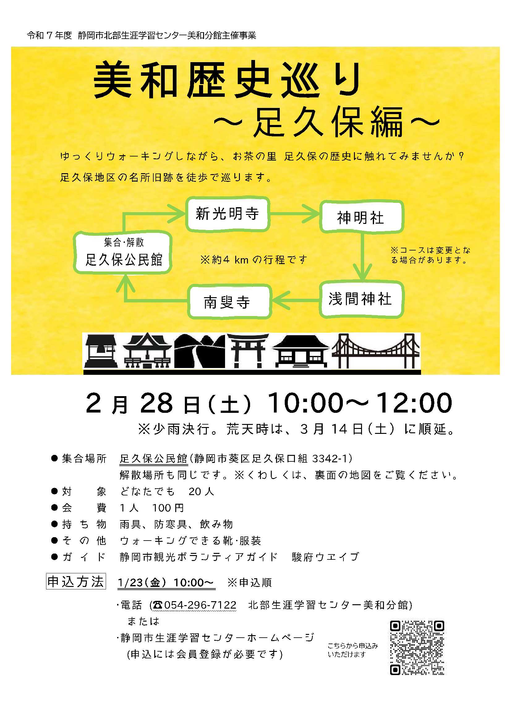 | 問い合わせ先 | 北部生涯学習センター美和分館(電話:054-296-7122) |