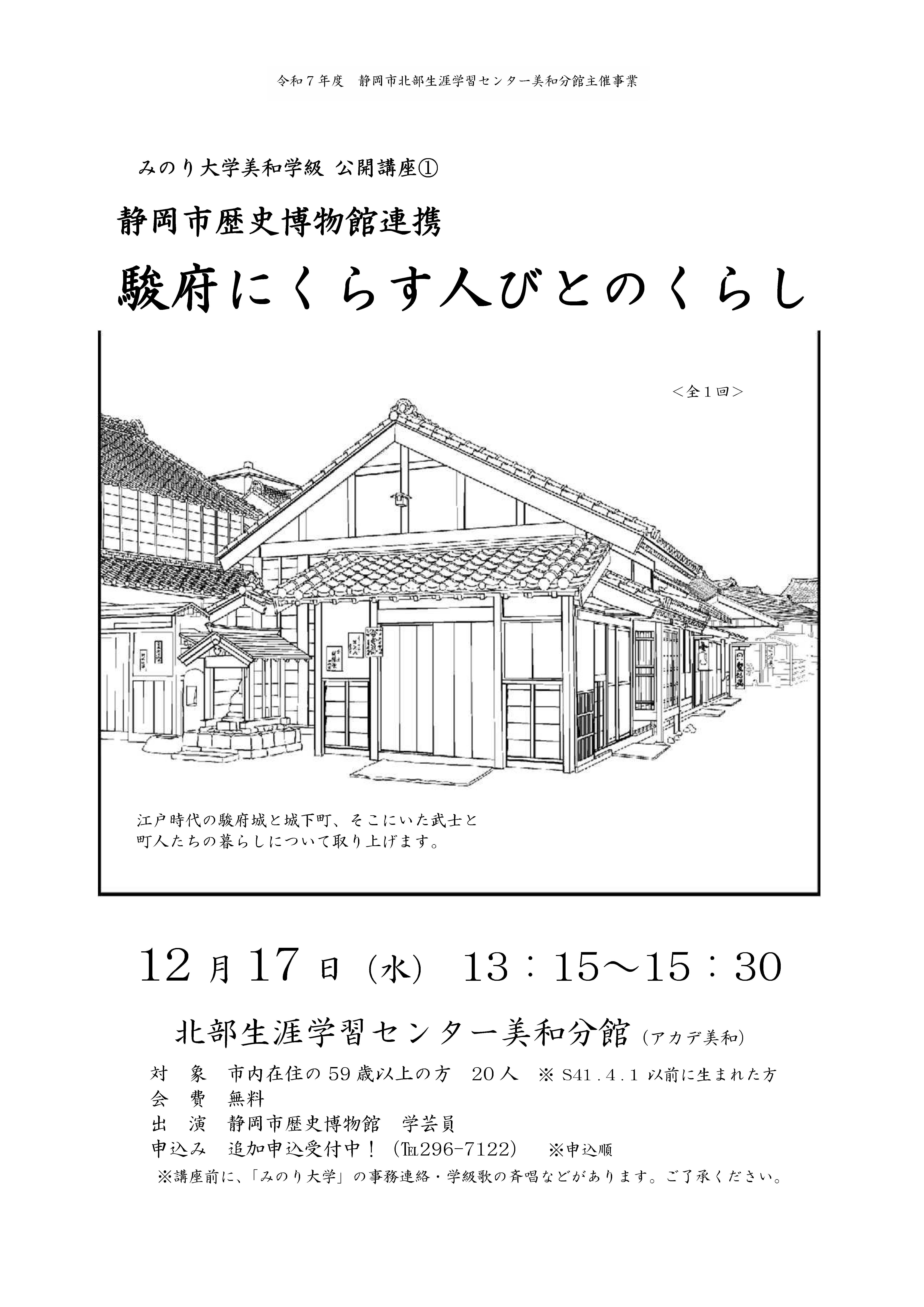 | 内容 | みのり大学公開講座① 静岡市歴史博物館の学芸員から「駿府にくらす人々のくらし」テーマに、 時は江戸時代、駿府城と城下町にいた武士や町人たちの暮らしについて取り上げます。 ※みのり大学美和学級の公開講座として実施します。 |