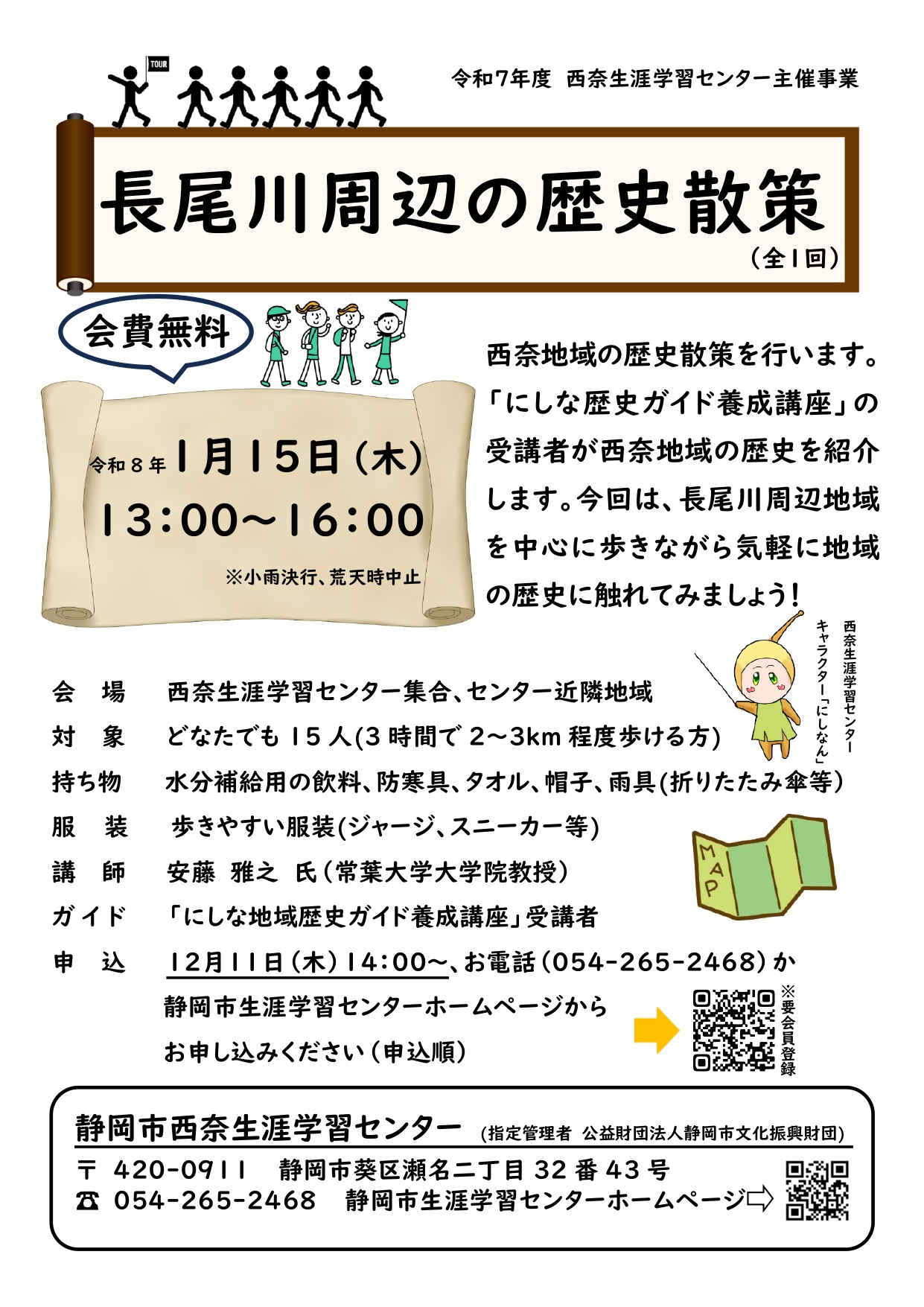 | 内容 | 「にしな歴史ガイド養成講座」受講者の方が考案したウォーキングを通して西奈地域の歴史を学びます。 |