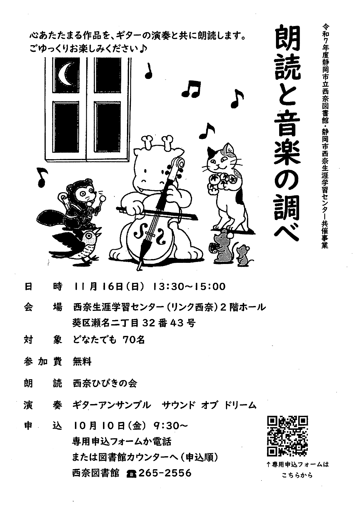 | 内容 | 西奈図書館のボランティアサークル「西奈ひびきの会」の朗読とともに「ギターアンサンブル サウンド オブ ドリーム」の演奏会を開催します。 |