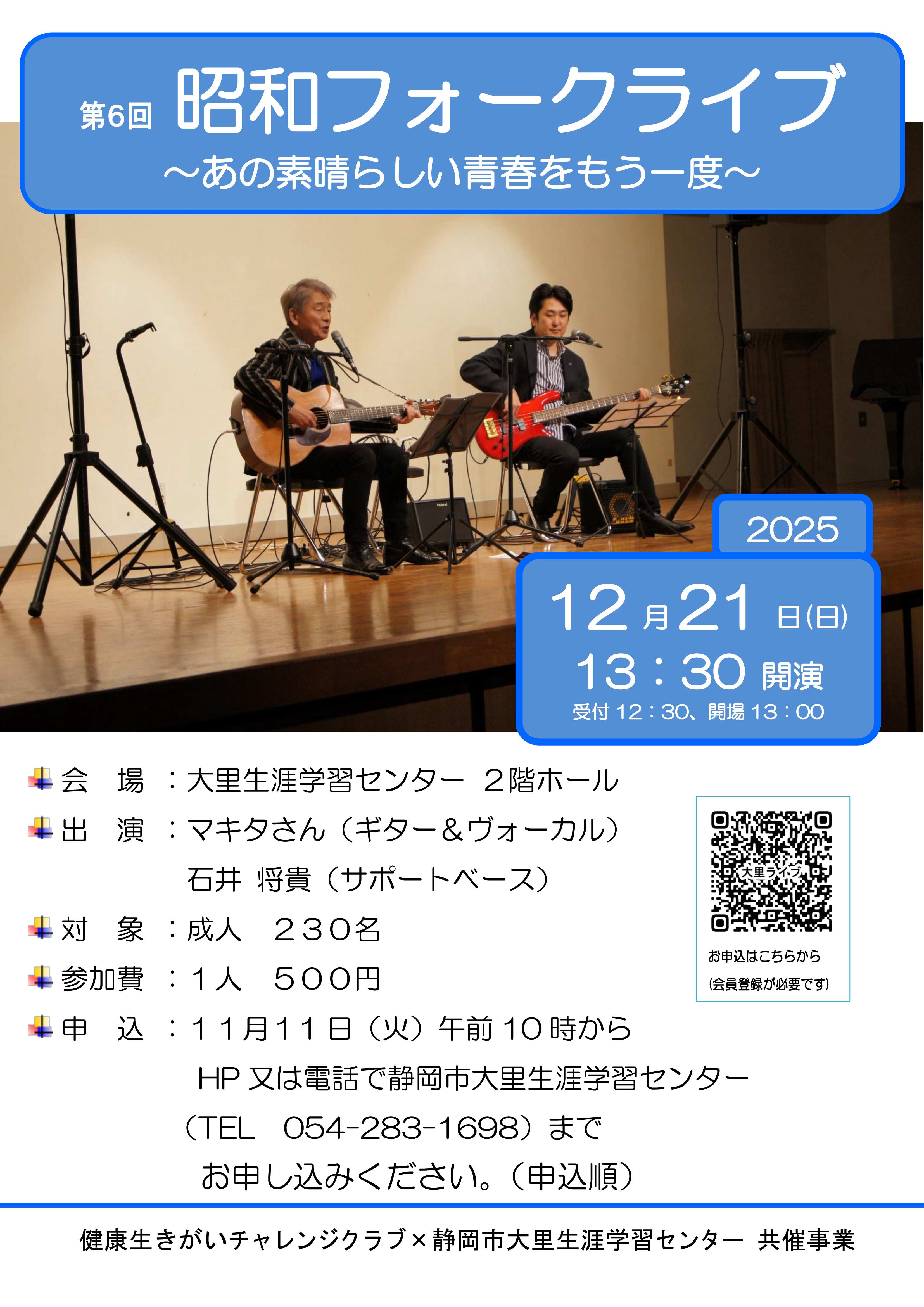 | 内容 | 昭和の名曲をワンコインで楽しむ大人向けコンサートです。 出演者:マキタさん(牧田守弘/ギター&ヴォーカル)、石井正貴(サポートベース) |