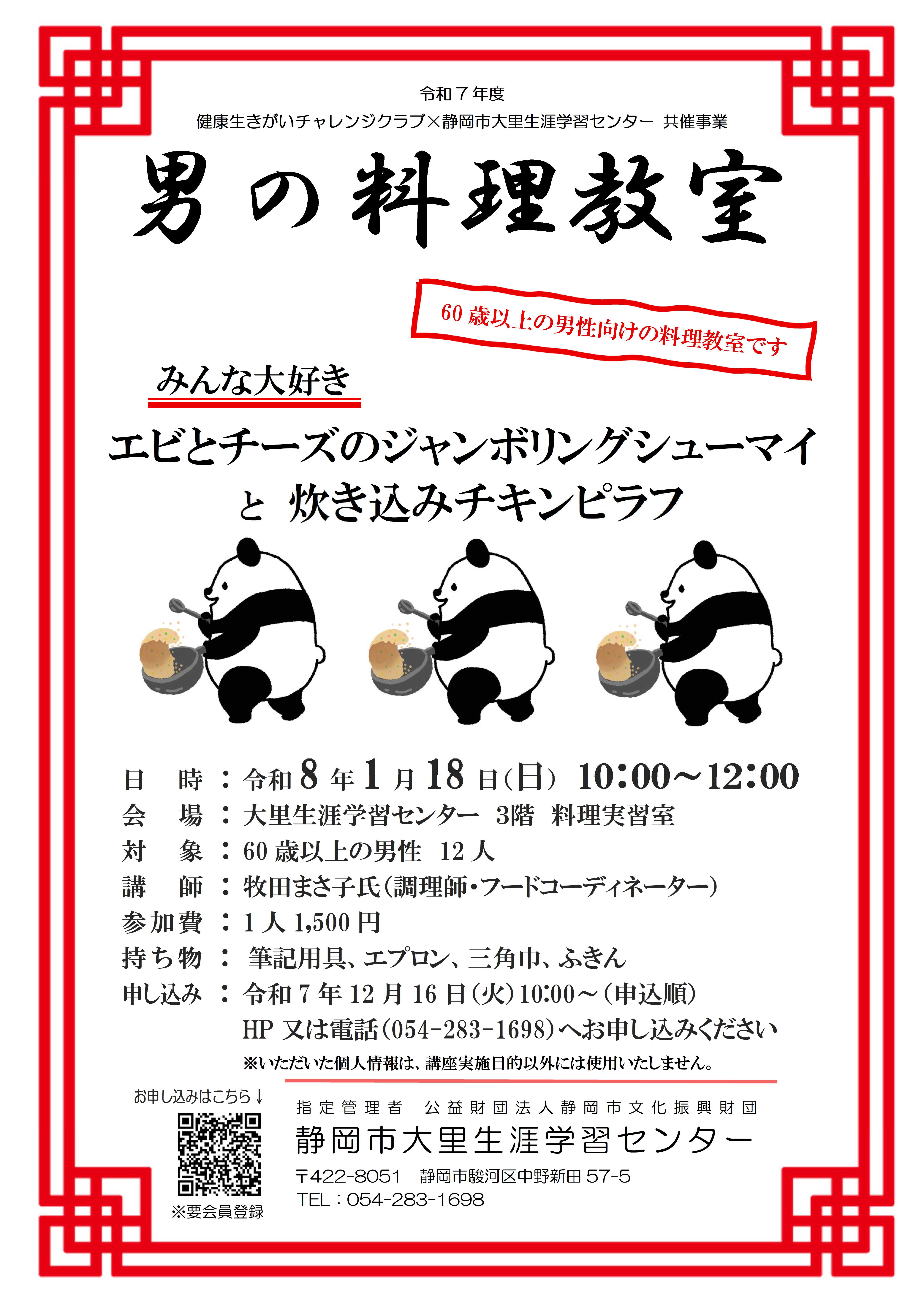 | 内容 | 男性を対象に、料理初心者でも挑戦しやすく、家庭で手軽に実践できる内容の料理実習体験講座を実施します。 メニュー:エビとチーズのジャンボリングシューマイと炊き込みチキンピラフ |