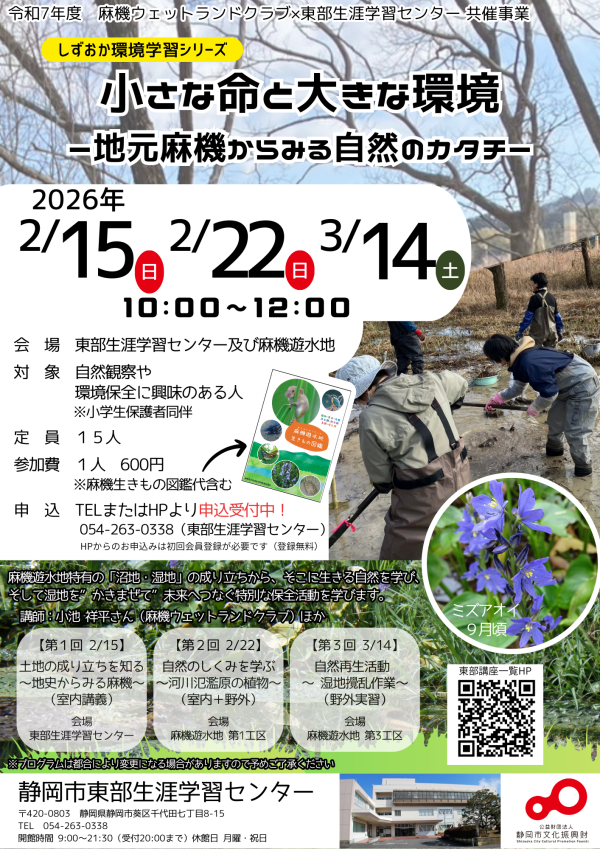 | 内容 | ~知識・体験・実践の3ステップで学ぶ自然学習講座。身近な自然から持続可能な地域づくりへ~ 「学ぶ→体験→実践」へとステップアップする全3回の連続講座です。 麻機遊水地特有の「沼地・湿地」の成り立ちから、そこに生きる自然を学び、そして湿地を”かきまぜて”未来へつなぐ特別な保全活動まで体験できます。 自然が好きな方、環境保護活動に参加したい方、親子での参加も大歓迎です! |
