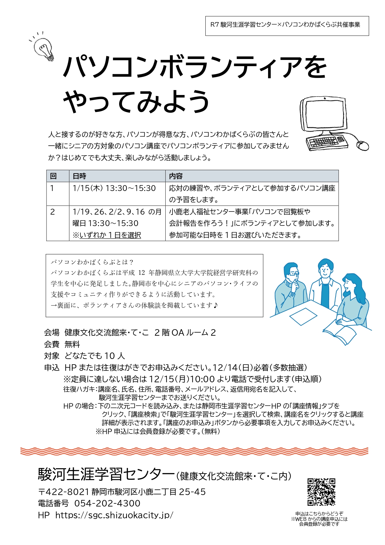 | 問い合わせ先 | 駿河生涯学習センター(電話:054-202-4300) |