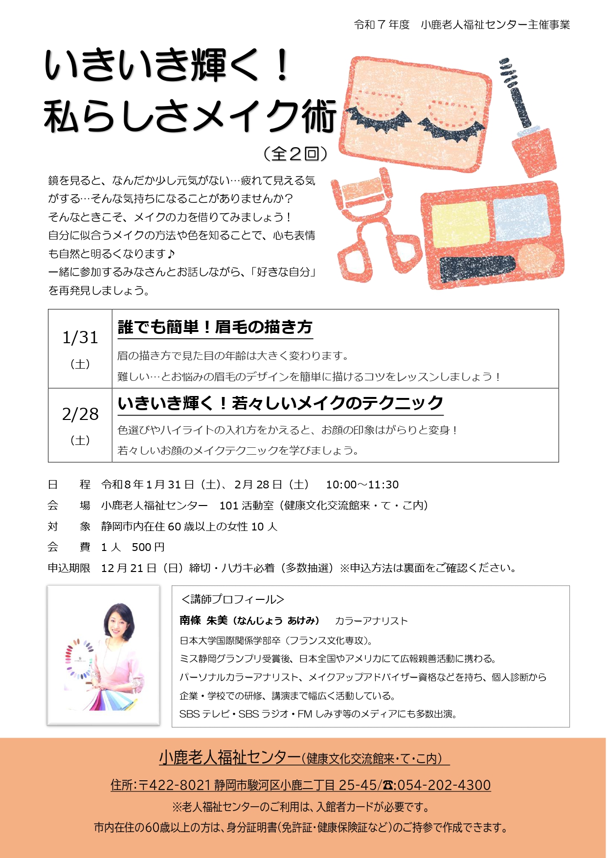 | 内容 | 眉毛の描き方、メイクのテクニックを学びます。眉毛やメイクの色選びでお顔の印象はがらりと変わります! ちょっとした工夫で、毎日がもっと楽しくなるメイクを一緒に学びましょう。 |