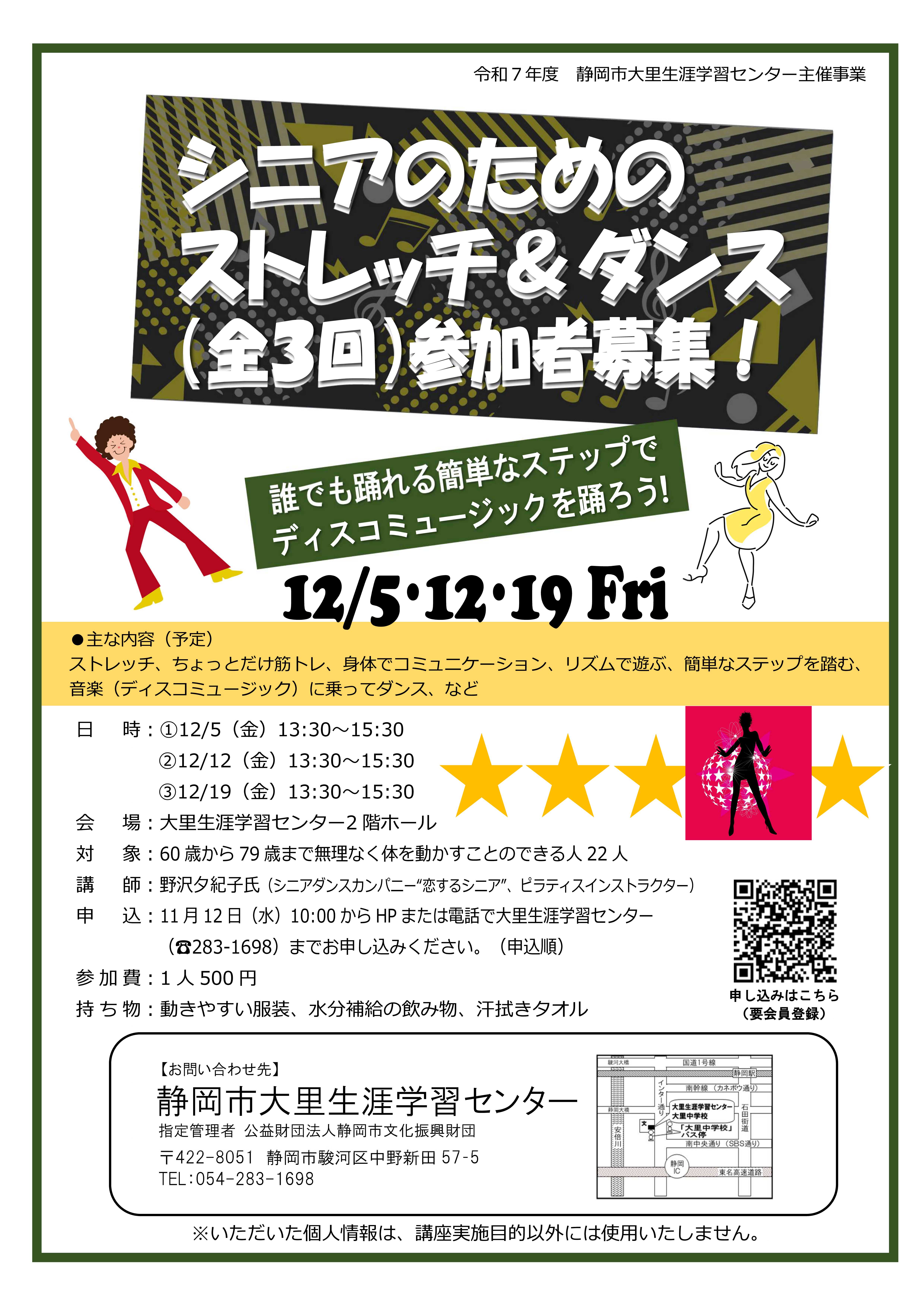 | 内容 | シニア向けダンス講座を実施、ダンスに触れる機会を提供する。 |