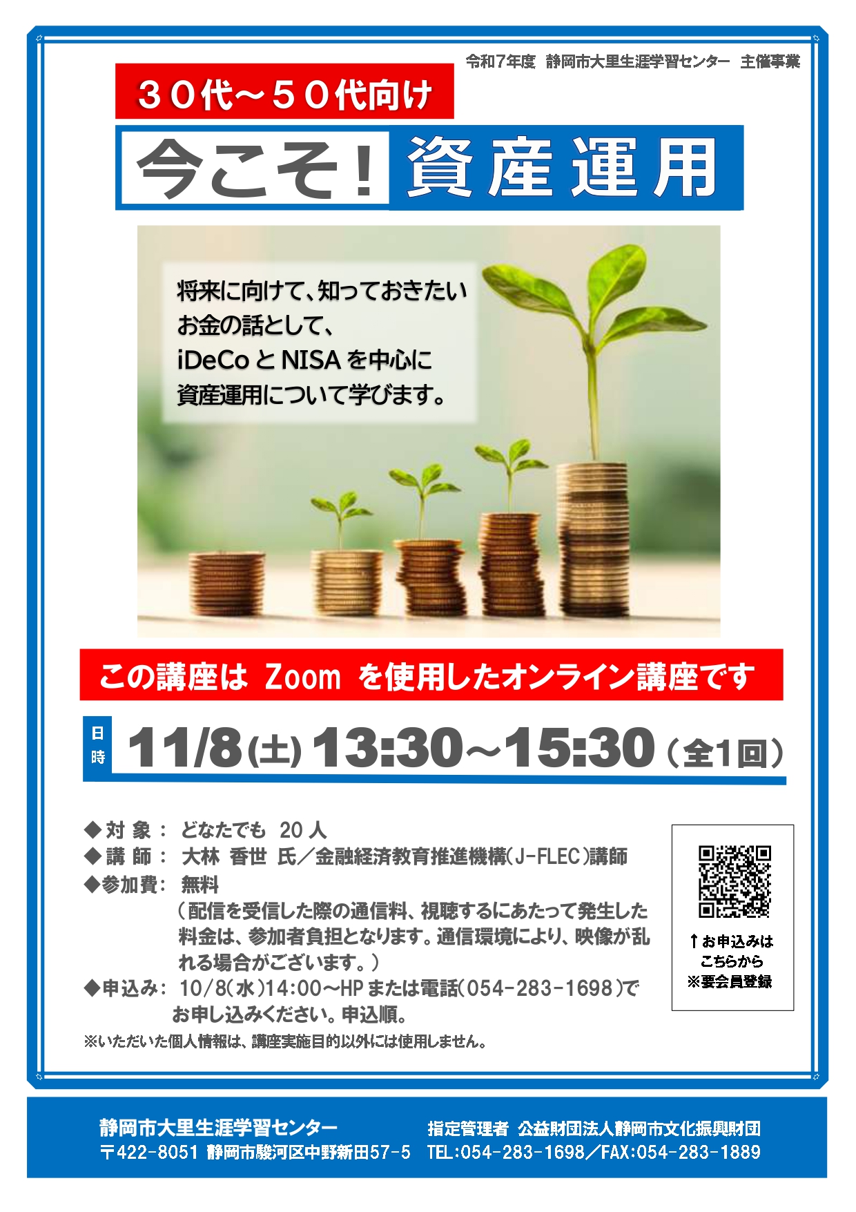 HP・電話[10/8(水)14:00~・申込順] ※WEBからの講座申込には会員登録が必要です |