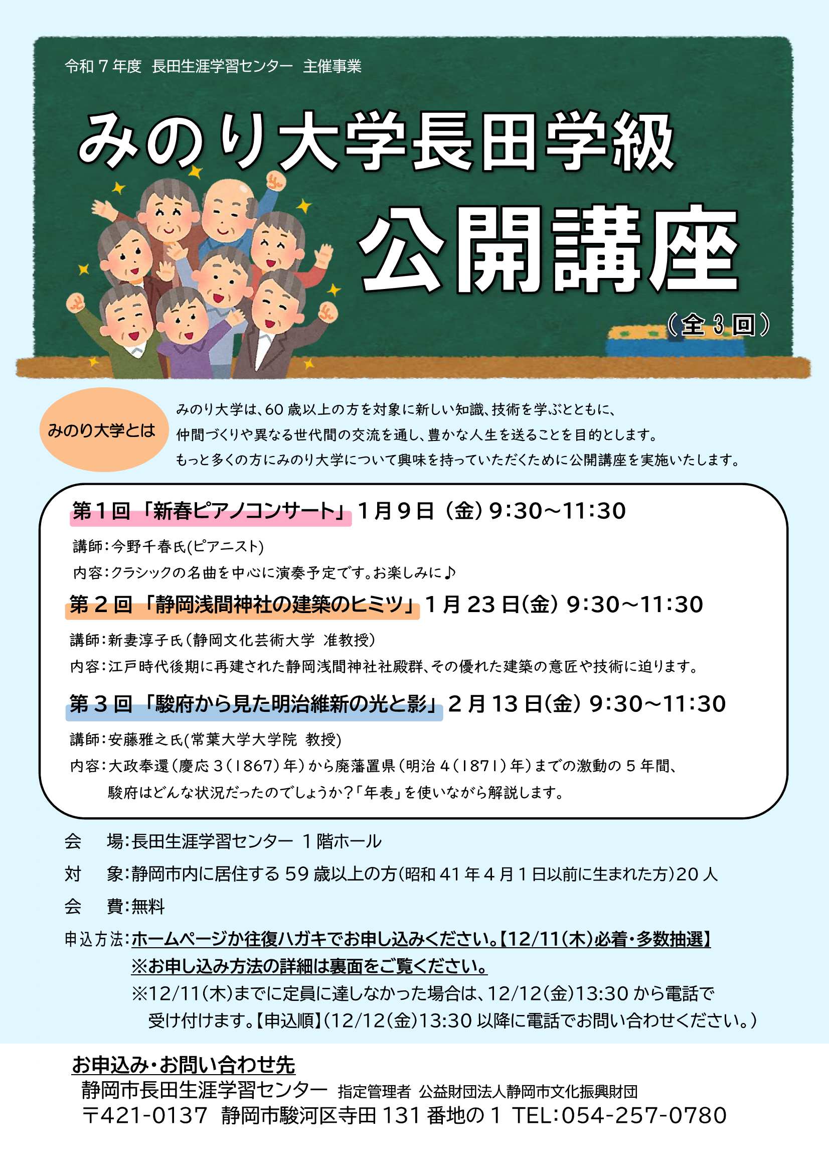 | 内容 | みのり大学を体験できる講座です。「新春ピアノコンサート」「静岡浅間神社の建築のヒミツ」「駿府から見た明治維新の光と影」の全3回です。 |