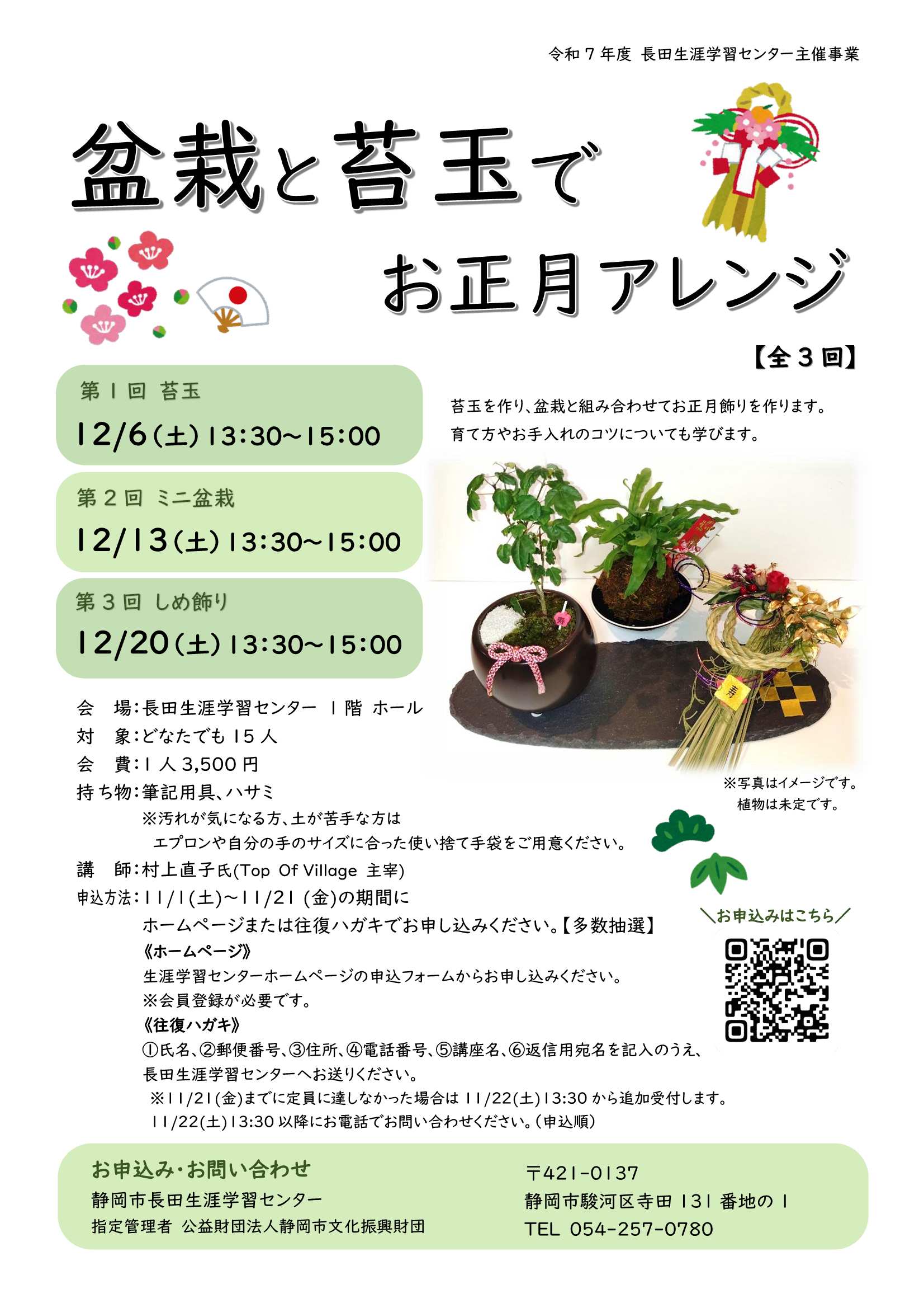 | 内容 | 苔玉を作り、盆栽と組み合わせてお正月飾りを作ります。育て方やお手入れのコツについても学びます。 |