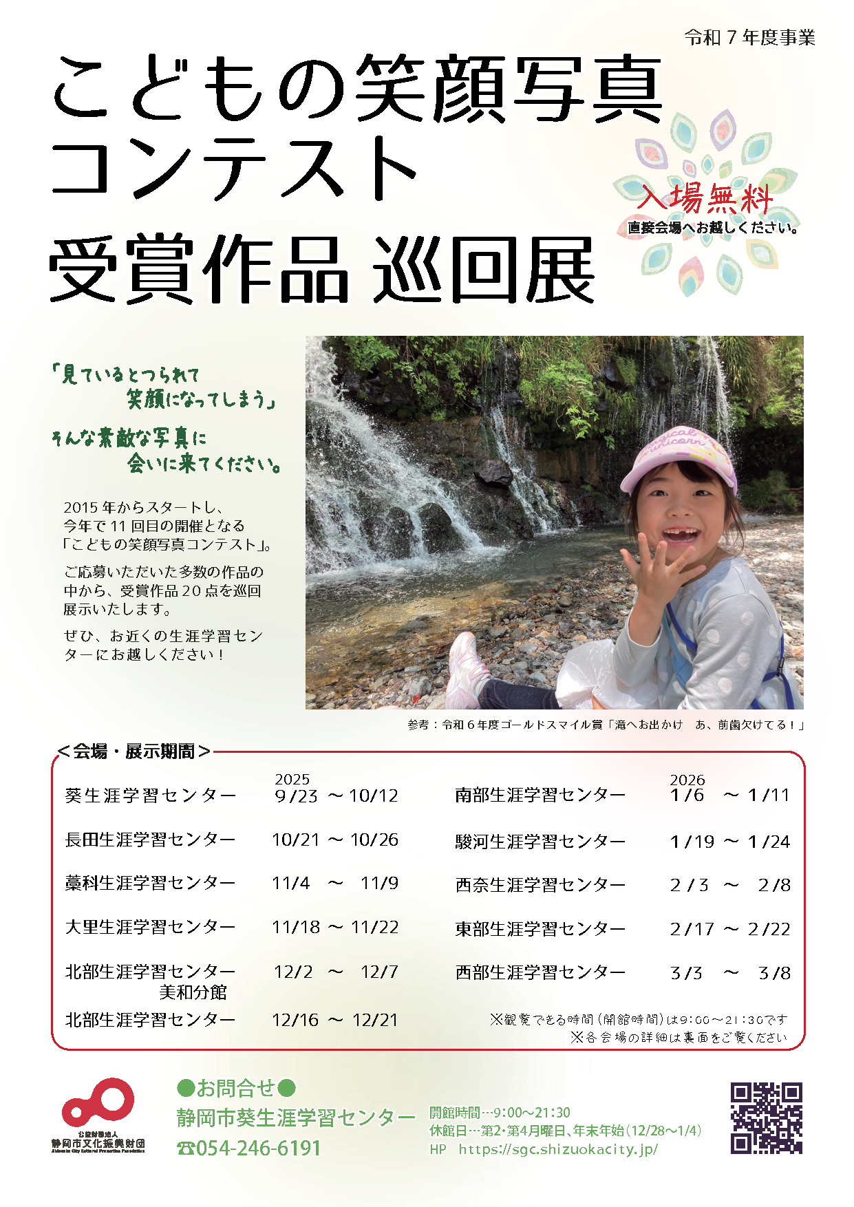 内容 | 「見ているとつられて笑顔になってしまう」そんな素敵な笑顔の写真を集めた写真展です。静岡市の生涯学習センター11館を会場に巡回展示します。 ご家族、ご友人もお誘い合わせの上、是非お越しください。 |