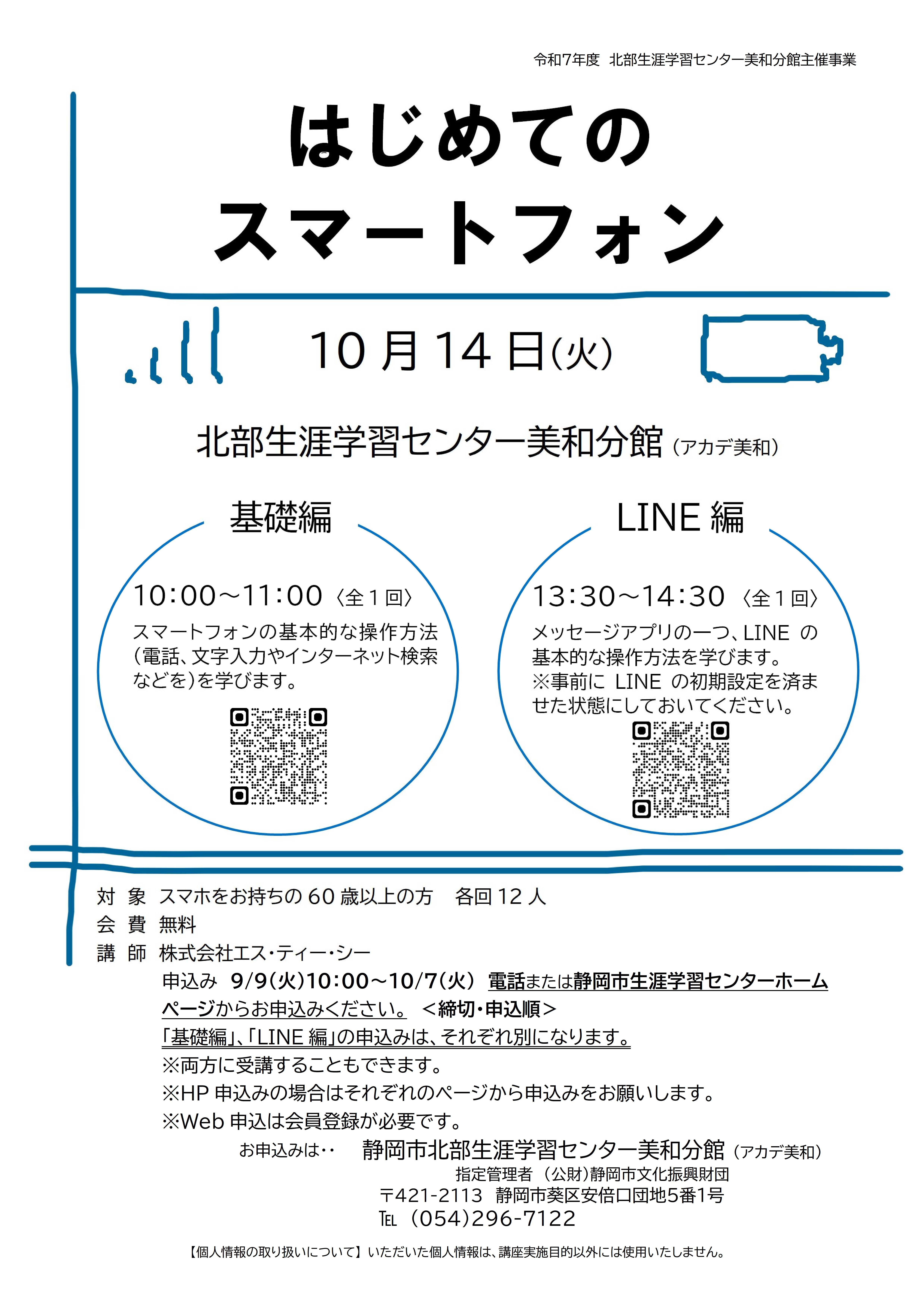 内容 | スマートフォン初心者向けにLINEの機能や使い方を学ぶ。 スマートフォン初心者向けにスマートフォンの機能や使い方を学びます。 午全10:00から「はじめてのスマートフォン ~基礎編~」も行います! 両方受講も大歓迎!ぜひご検討ください。 静岡市生涯学習センターHPから「講座情報」にアクセス→講座検索のキーワードから「はじめてのスマートフォン」と検索してください。 ※お申し込みは別になりますのでご注意ください。 |