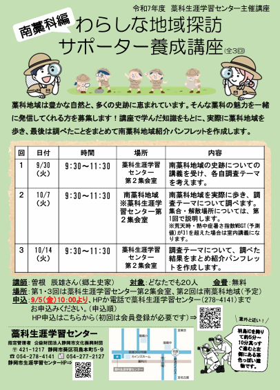 内容 | 藁科生涯学習センターと一緒に、藁科地域の魅力を紹介する「わらしな地域探訪サポーター」を募集します!今年度は南藁科地域を取り上げます。 |