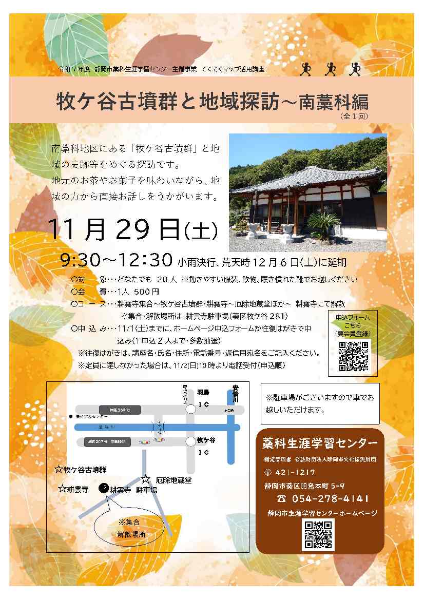 内容 | 地元のお茶やお菓子を味わいながら「牧ケ谷古墳群」と地域の史跡等をめぐります。(小雨決行、荒天時12/6(土)に延期) 耕雲寺駐車場集合・解散 |