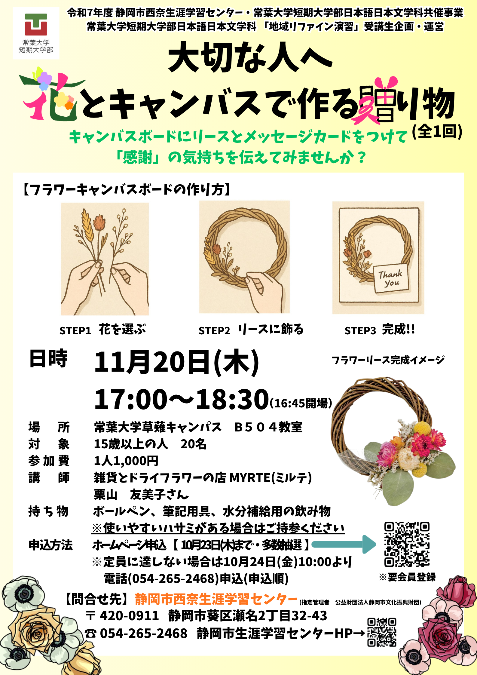 内容 | キャンバスボードと花材で、オリジナルのフラワーリースを制作します。常葉大学静岡草薙キャンパス集合・解散 |