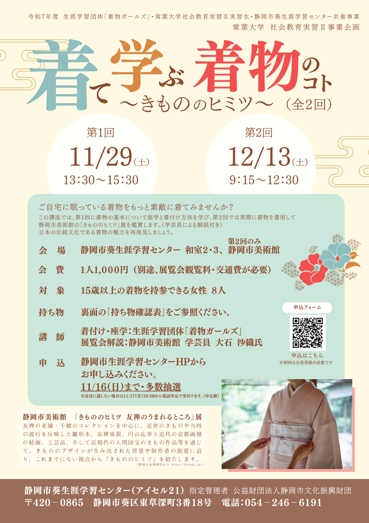 | 内容 | 着付けの基本を学び、着物を着て静岡市美術館の「きもののヒミツ」展を鑑賞します。学芸員による解説付きです。 |