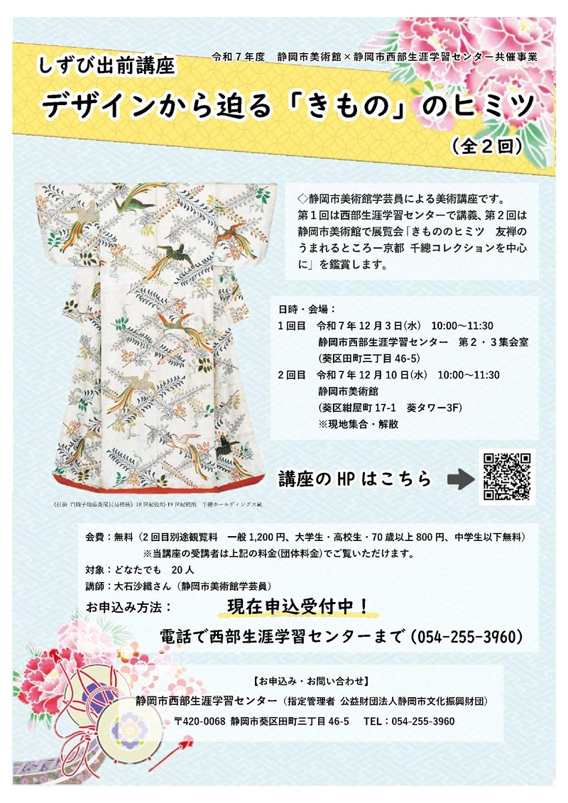 | 内容 | 静岡市美術館学芸員による特別展「きもののヒミツ 友禅のうまれるところ-京都 千總コレクションを中心に」の美術講座です。2回目は静岡市美術館で鑑賞を行います。 |