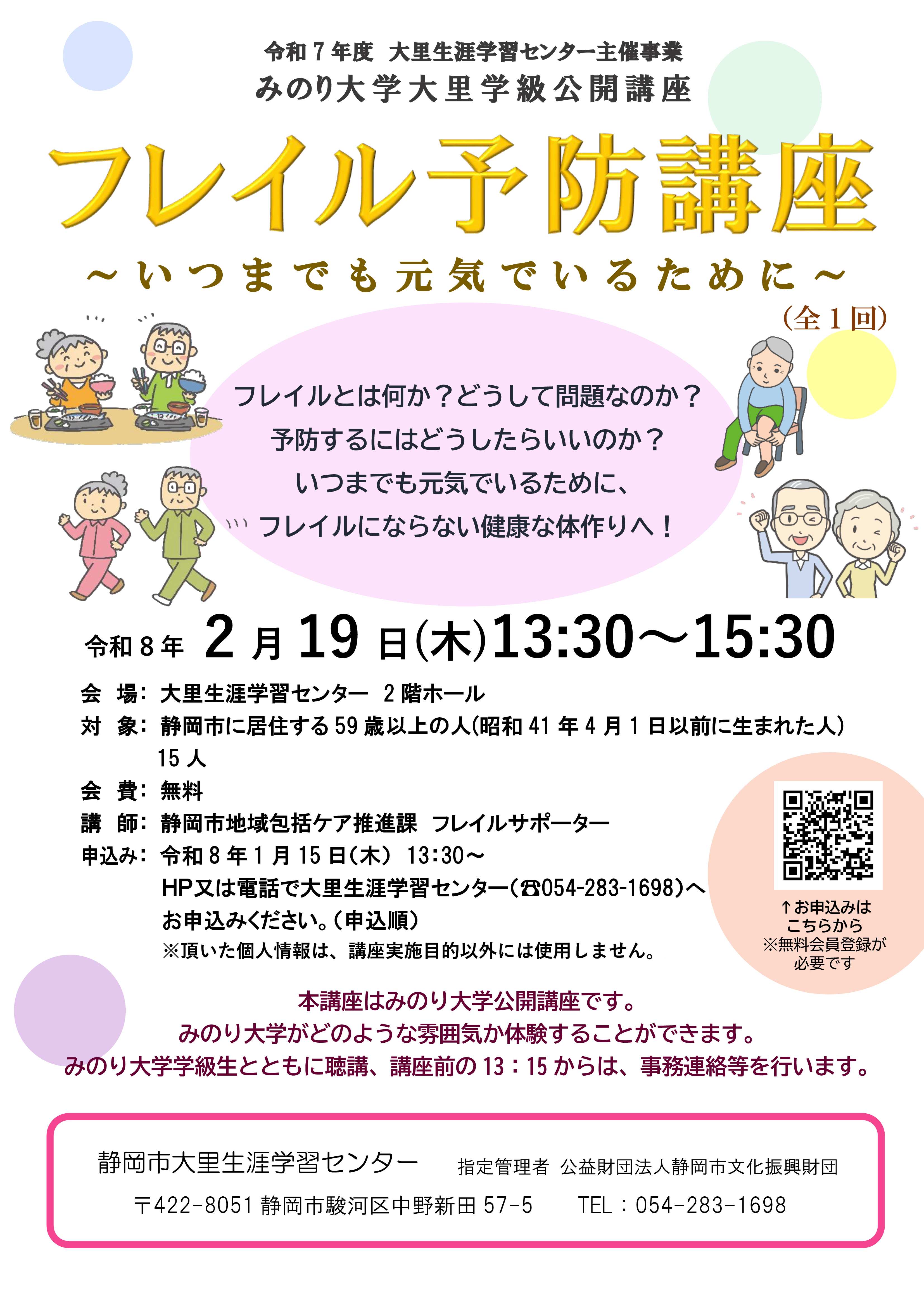 | 内容 | 静岡市内在住の高齢者を対象にみのり大学大里学級講座全16回のうち、2回を一般の高齢者に公開する講座。 |