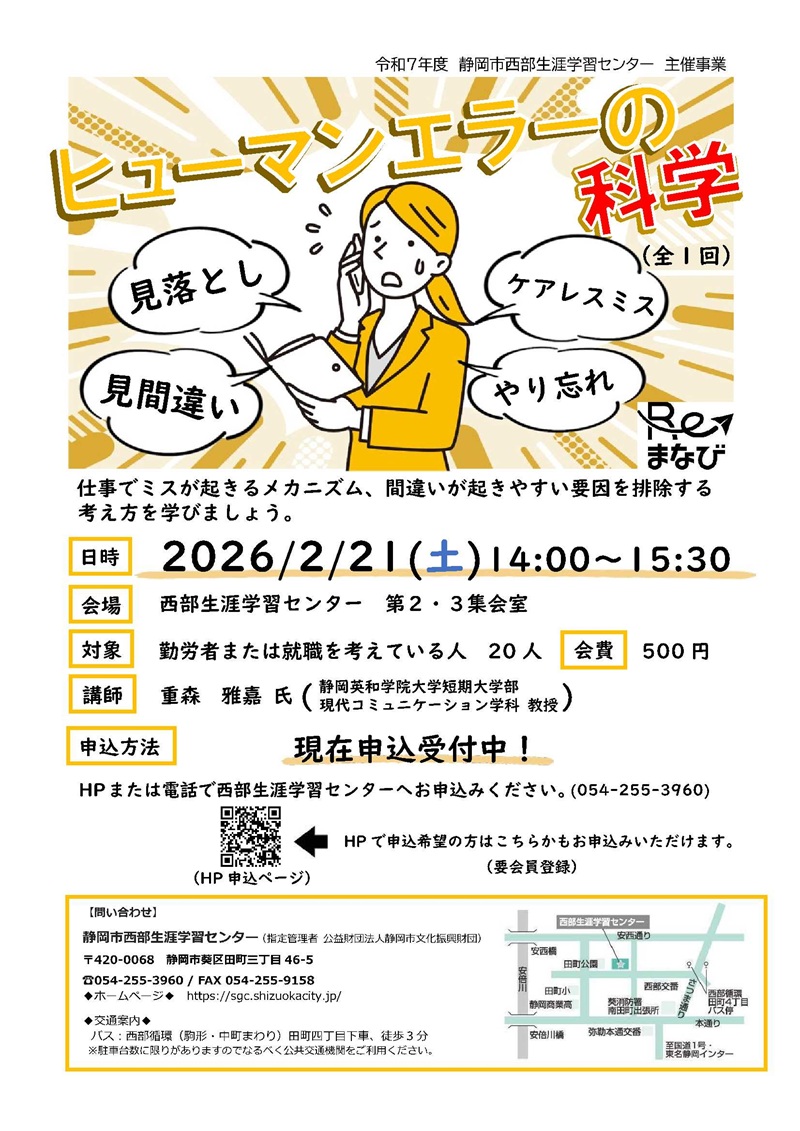 現在HPまたは電話にて申込受付中!(西部生涯学習センター:054-255-3960) ※WEBからの講座申込には会員登録が必要です |