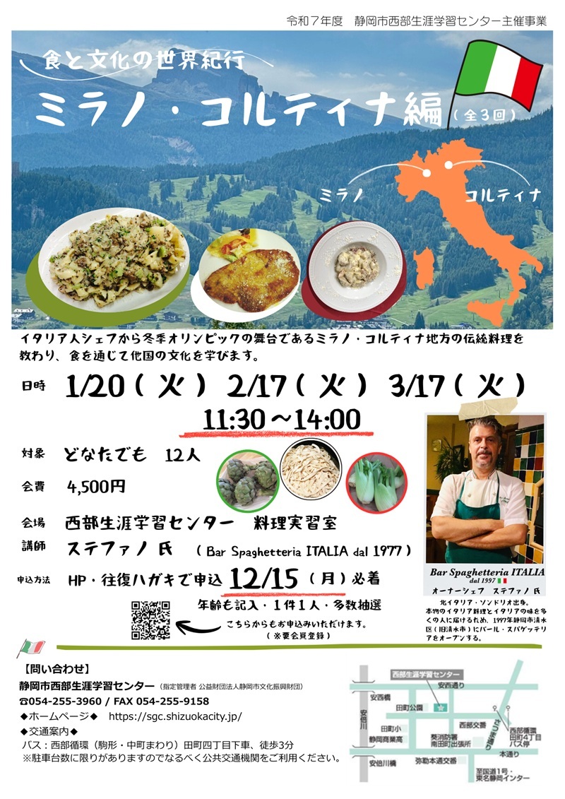 | 内容 | 2026冬季五輪の開催地である北イタリア地方の伝統料理を作り、食を通じて他国の文化を学びましょう。 |