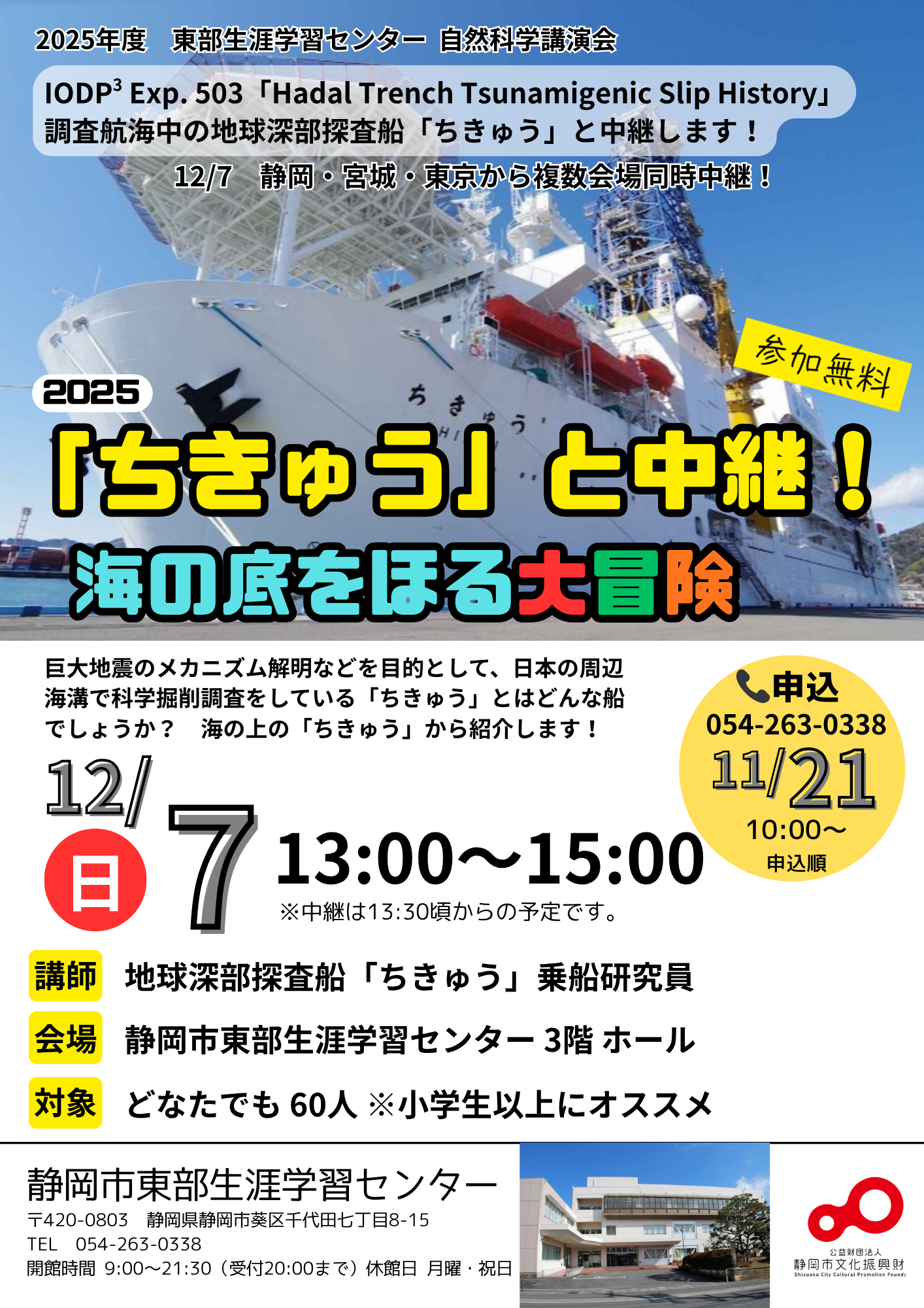 | 内容 | 巨大地震のメカニズム解明などを目的として、日本の周辺海溝で科学掘削調査をしている「ちきゅう」とはどんな船なのでしょうか? 海上の「ちきゅう」から研究現場を紹介します! |