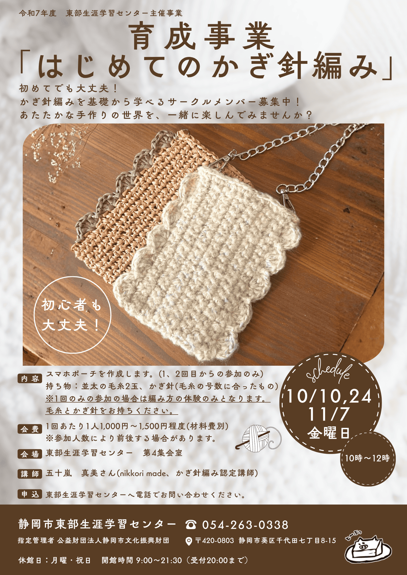| 内容 | 東部生涯学習センターで活動する「かぎ針編みサークル」育成講座を実施します。初心者大歓迎! 育成期間中はスマホポーチを作成します。(1、2回目からの参加のみ) 持ち物:並太の毛糸2玉、かぎ針(毛糸の号数に合ったもの) ※1回のみの参加の場合は編み方の体験のみとなります。毛糸とかぎ針をお持ちください。 お気軽にお問い合わせください。 |