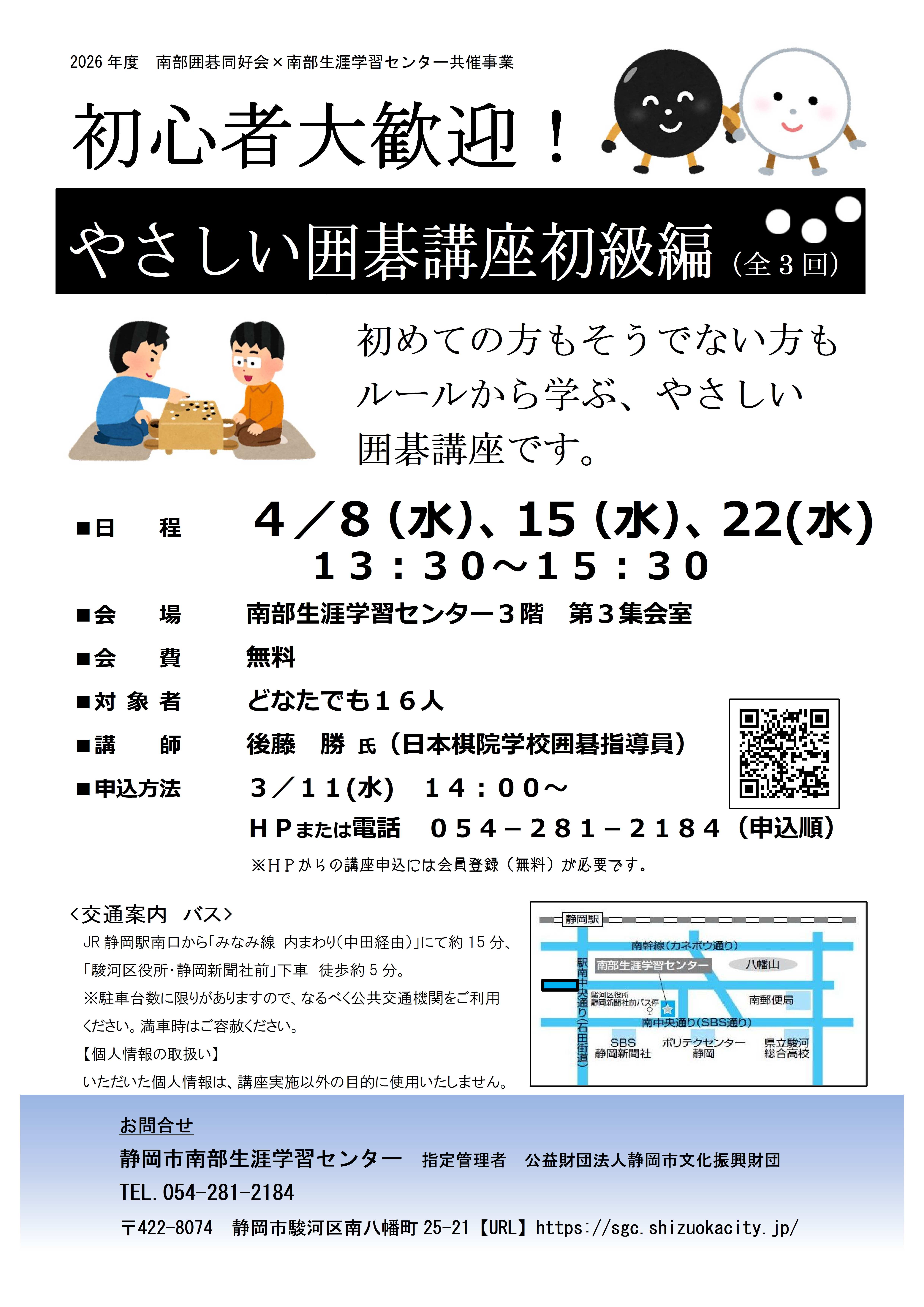 | 内容 | 初めての方もそうでない方もルールから学ぶ、やさしい囲碁講座です。 |