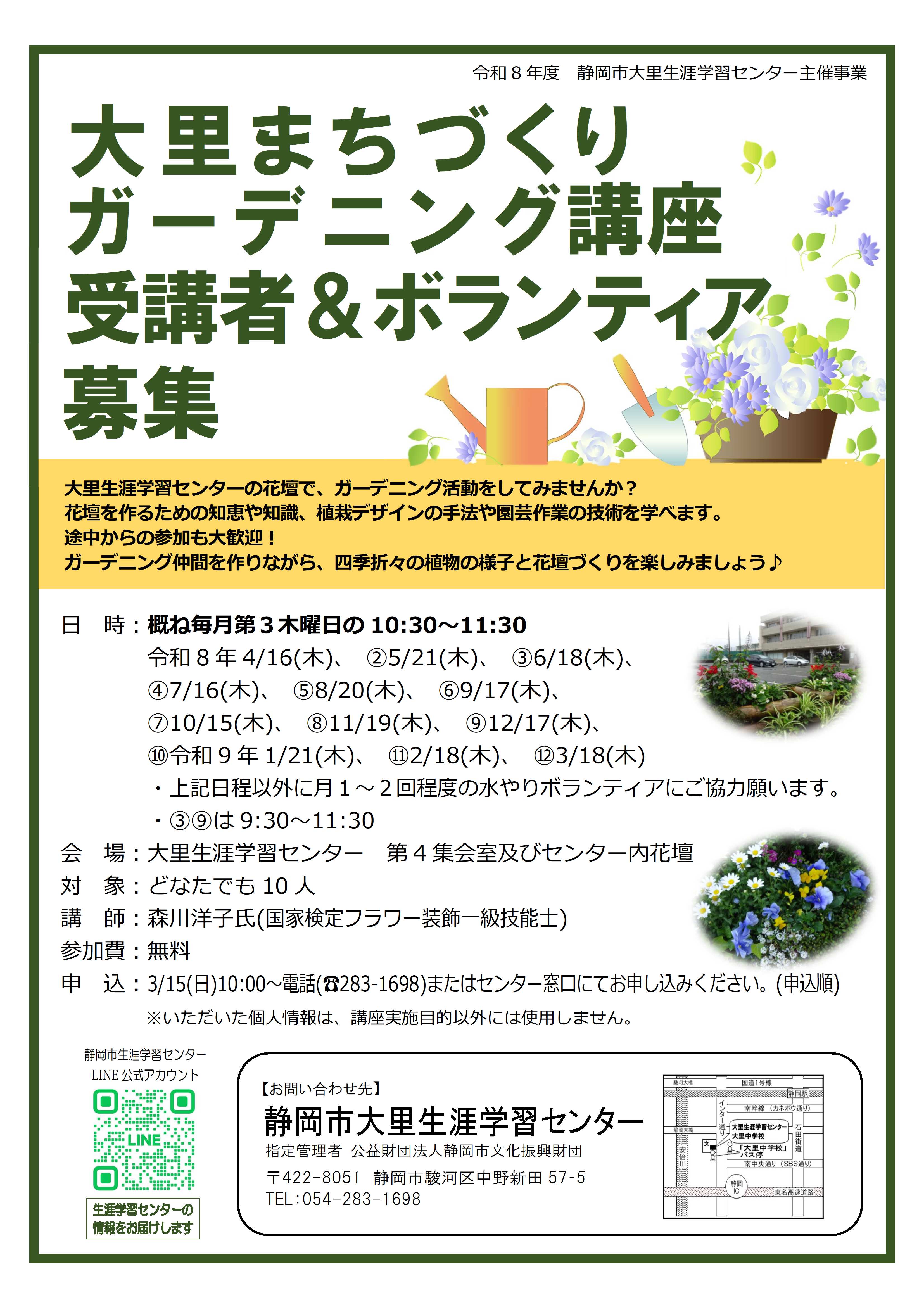 | 問い合わせ先 | 大里生涯学習センター(電話:054-283-1698) |