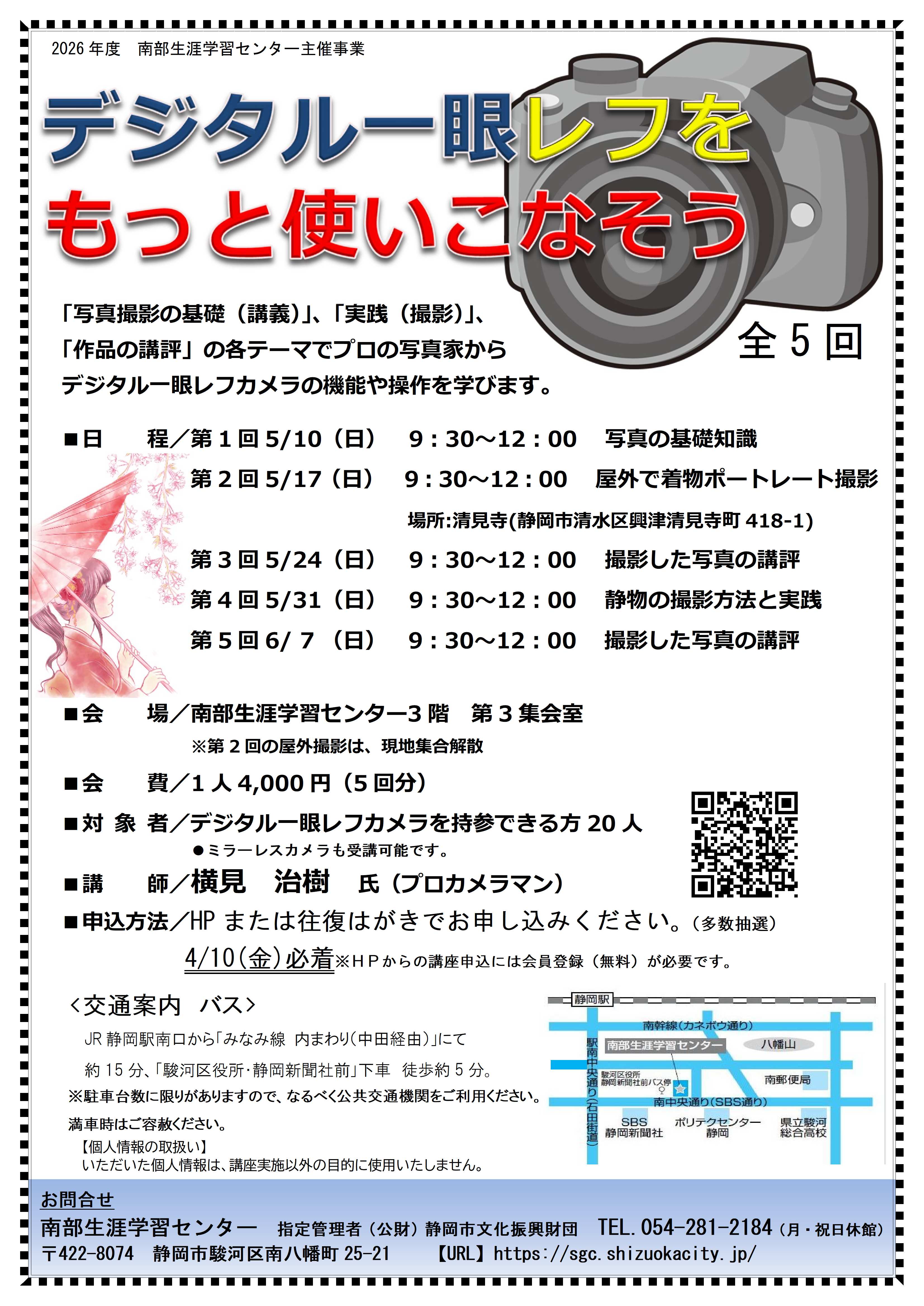 | 内容 | プロカメラマンからデジタル一眼レフカメラの機能や操作を学びます。 |