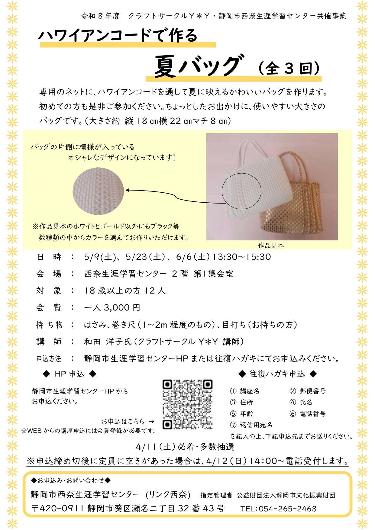 | 内容 | ハワイアンコードを使い、夏に映える手作りバッグを学ぶ講座です。 |