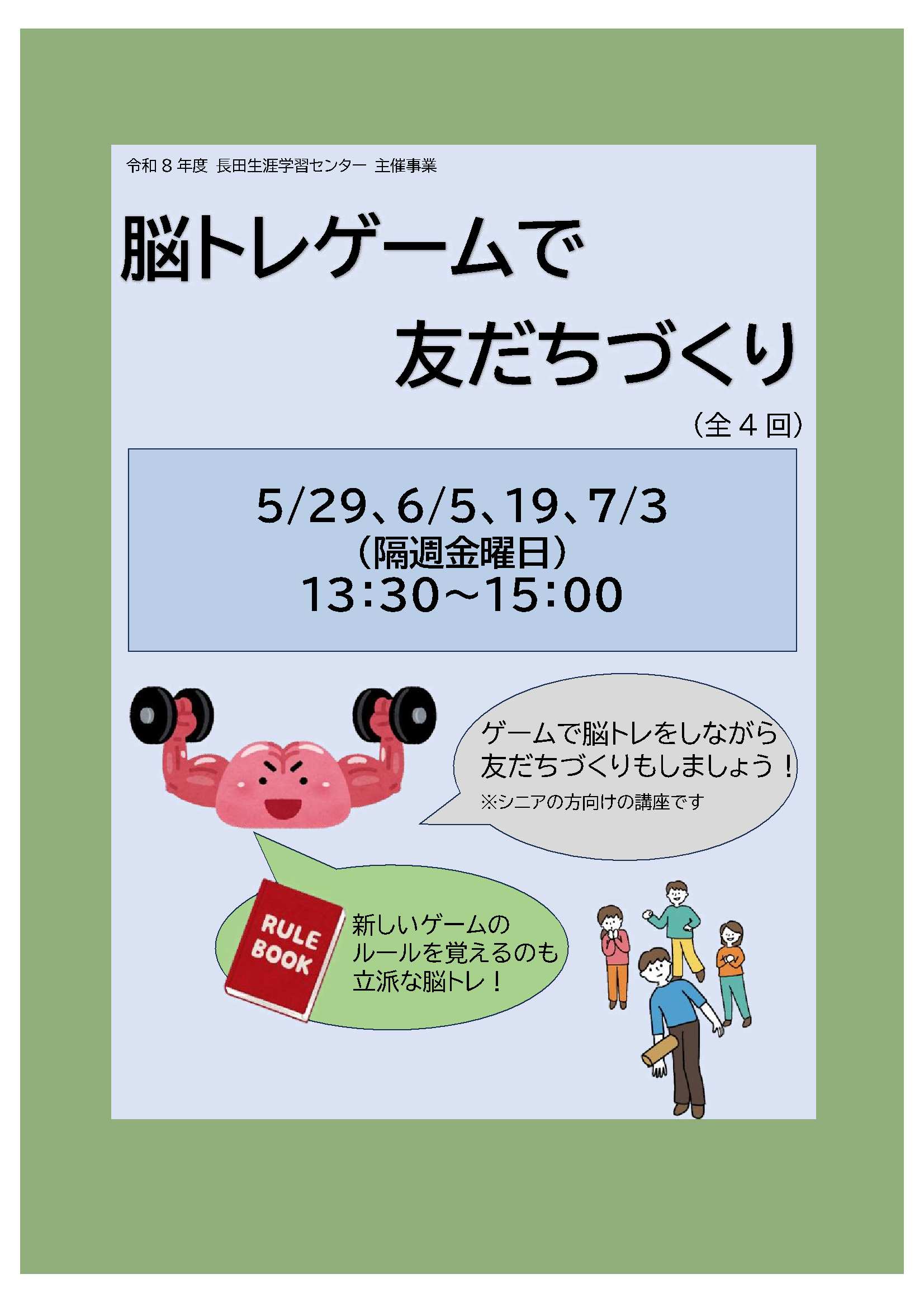 5/8(金)13:00~ 電話またはHPで長田生涯学習センターへ申し込む(申込順)。 2026/05/08から受付開始します |