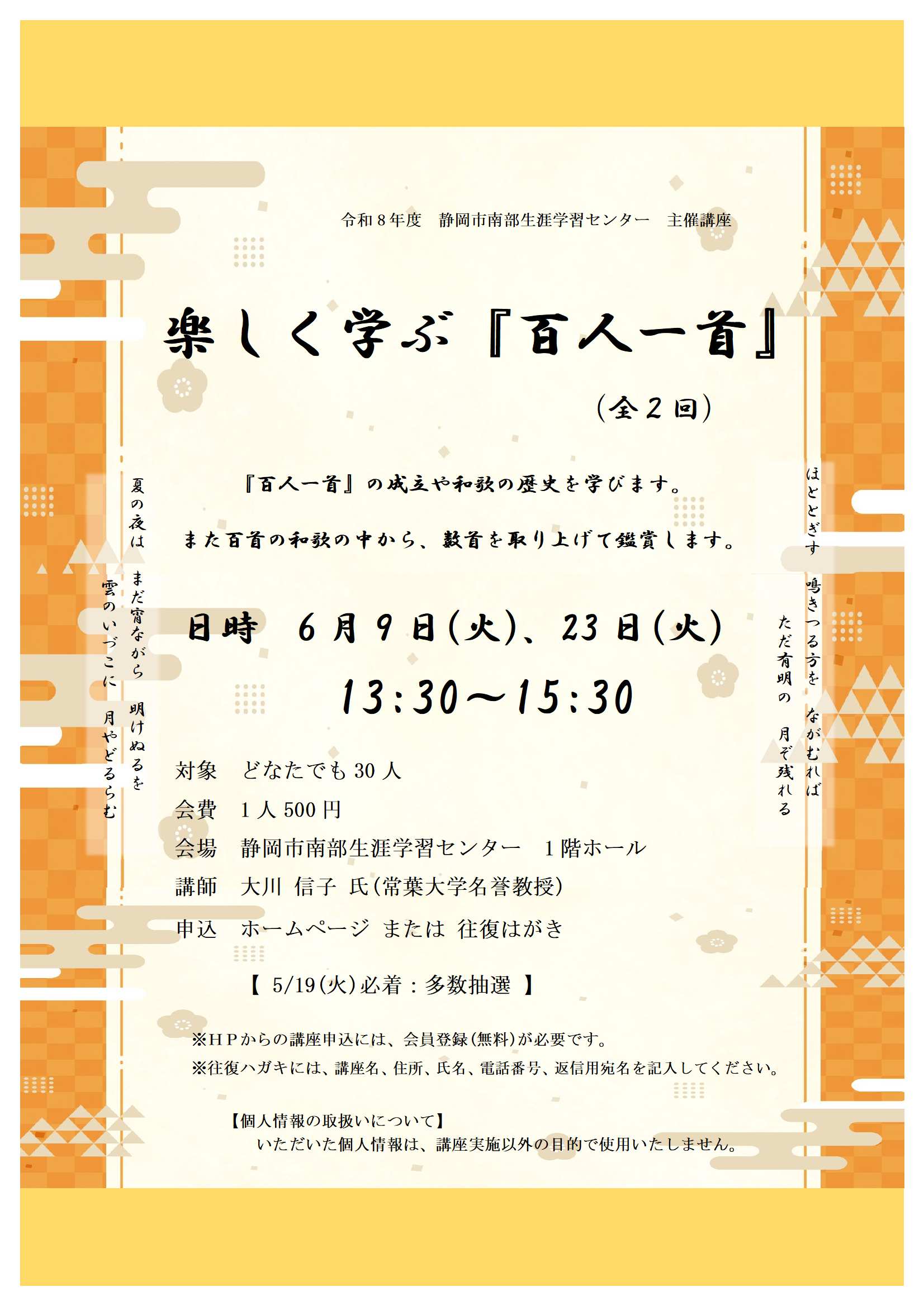 ※申込締め切り後に定員に空きがあった場合は、5/20(水)14:00~電話受付に切り替える。(申込順)